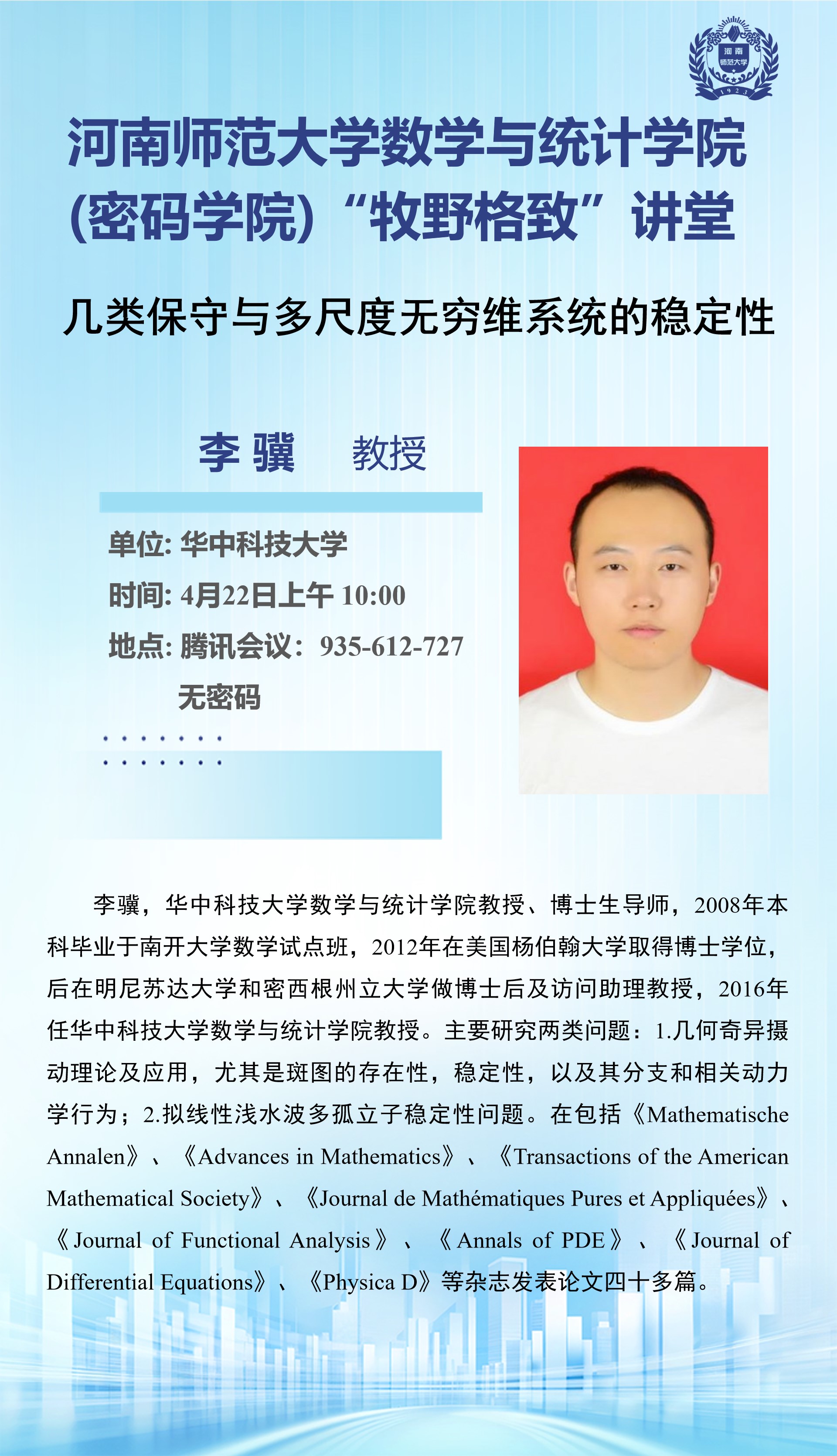 华中科技大学李骥教授将应邀做客“牧野格致”讲堂