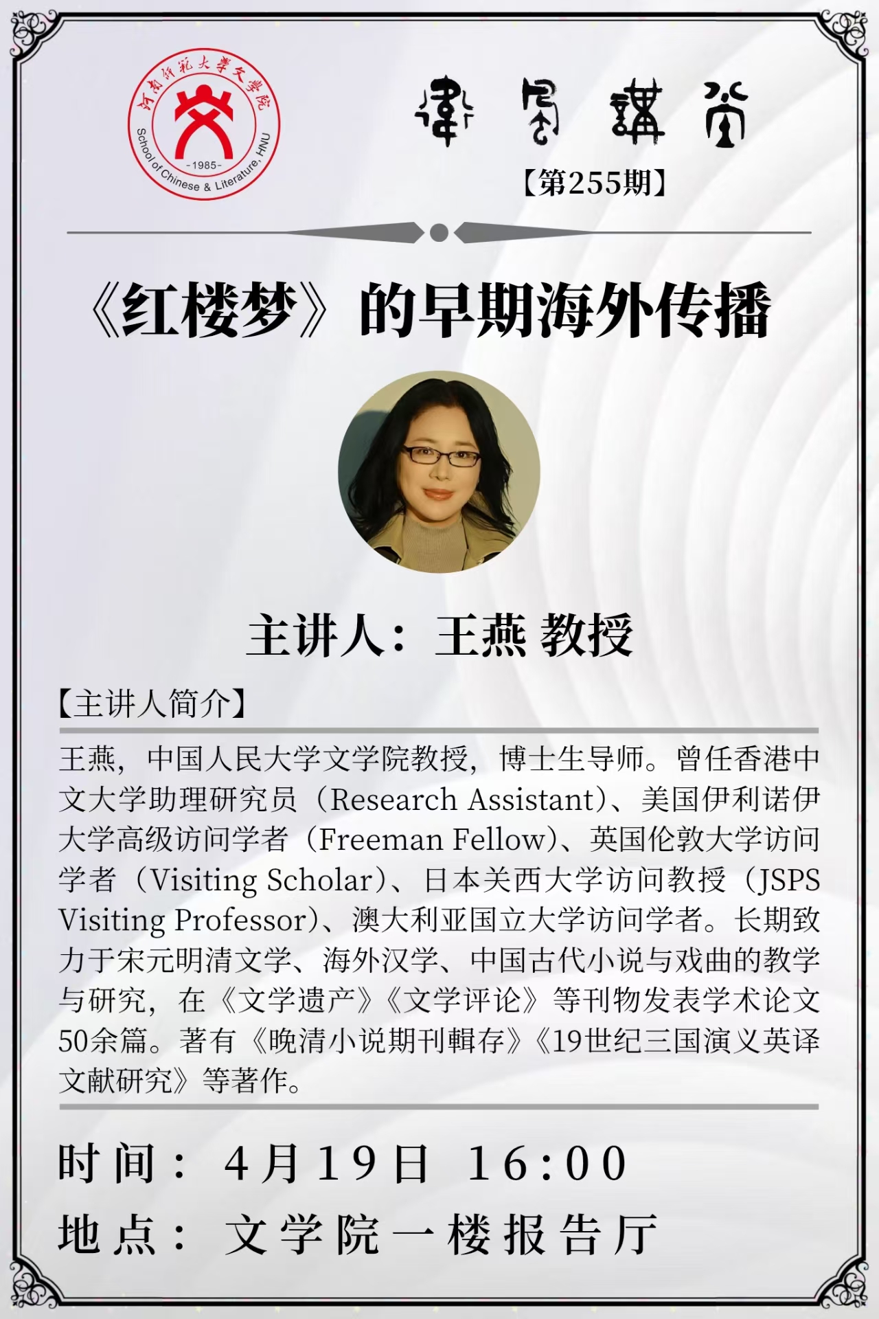 中国人民大学王燕教授将应邀做客“卫风讲堂”