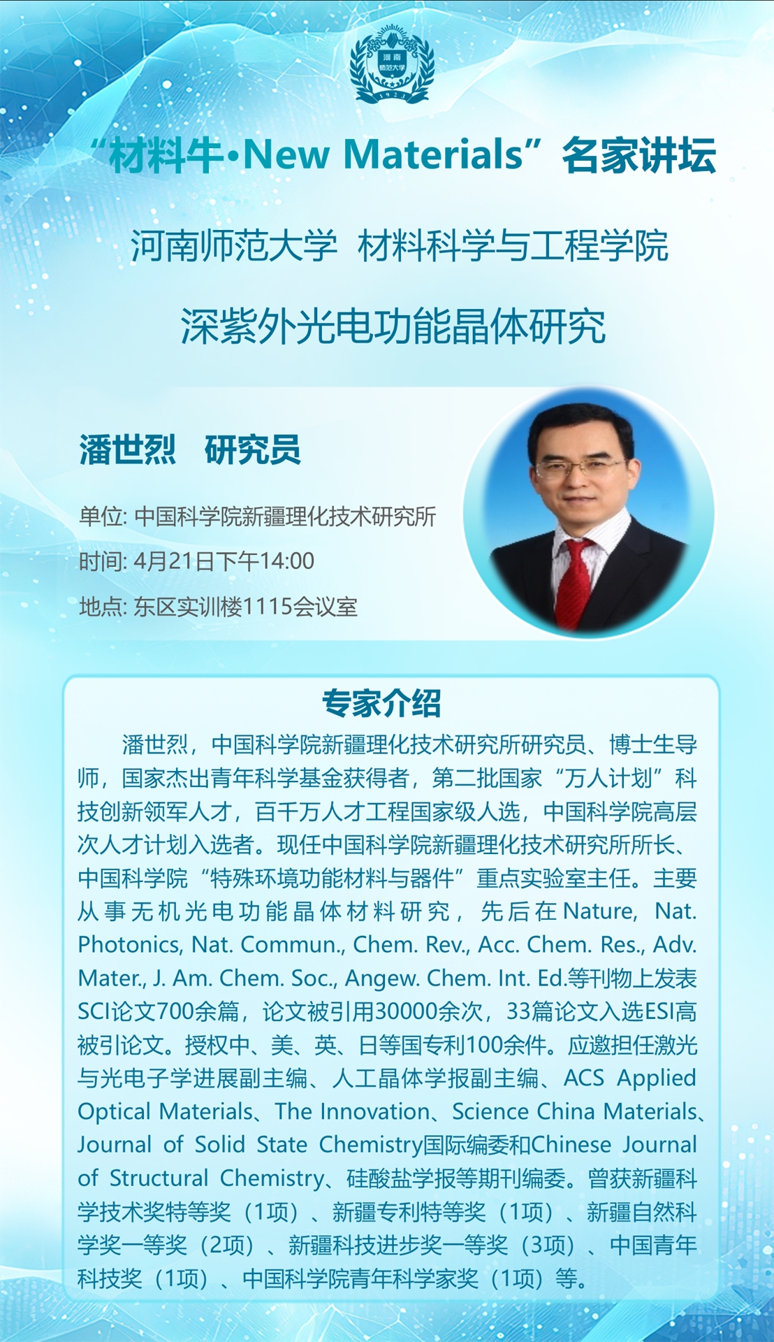 中国科学院新疆理化技术研究所潘世烈研究员将应邀做客“材料牛·New Materials”名家讲坛