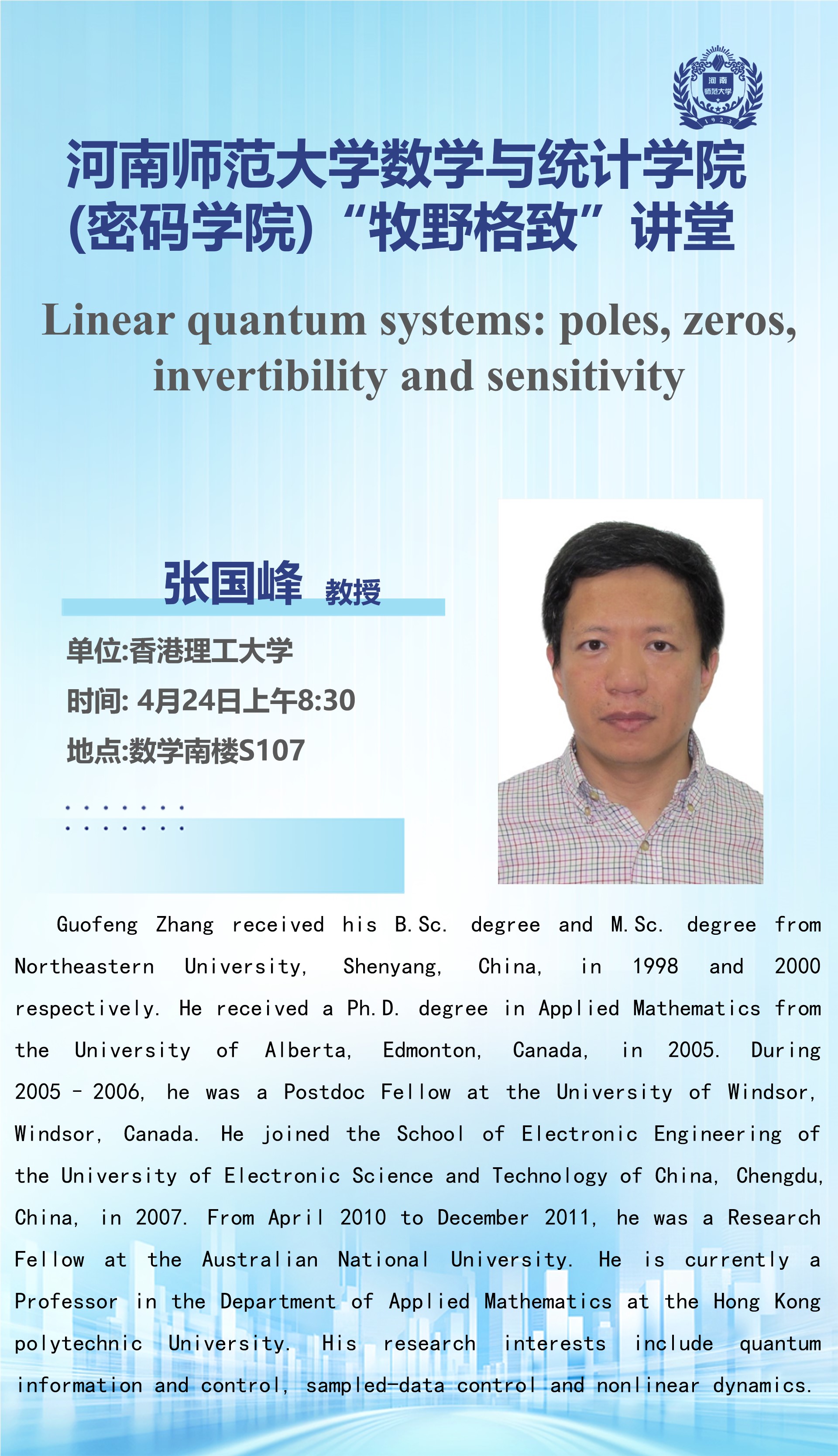 香港理工大学张国峰教授将应邀做客“牧野格致”讲堂