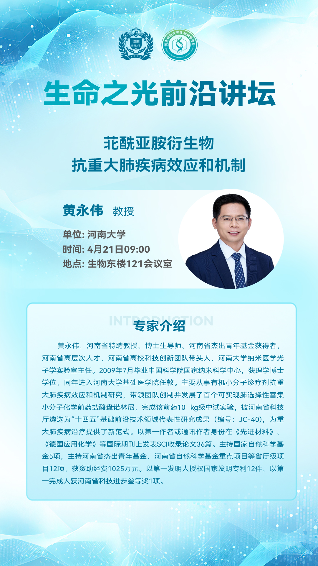 河南大学黄永伟教授将应邀做客“生命之光”前沿讲坛