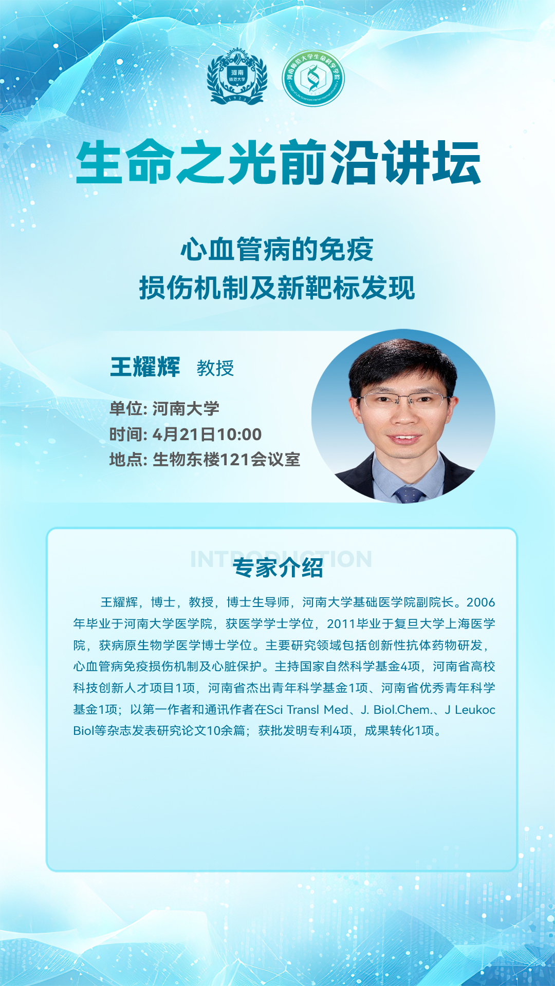 河南大学王耀辉教授将应邀做客“生命之光”前沿讲坛