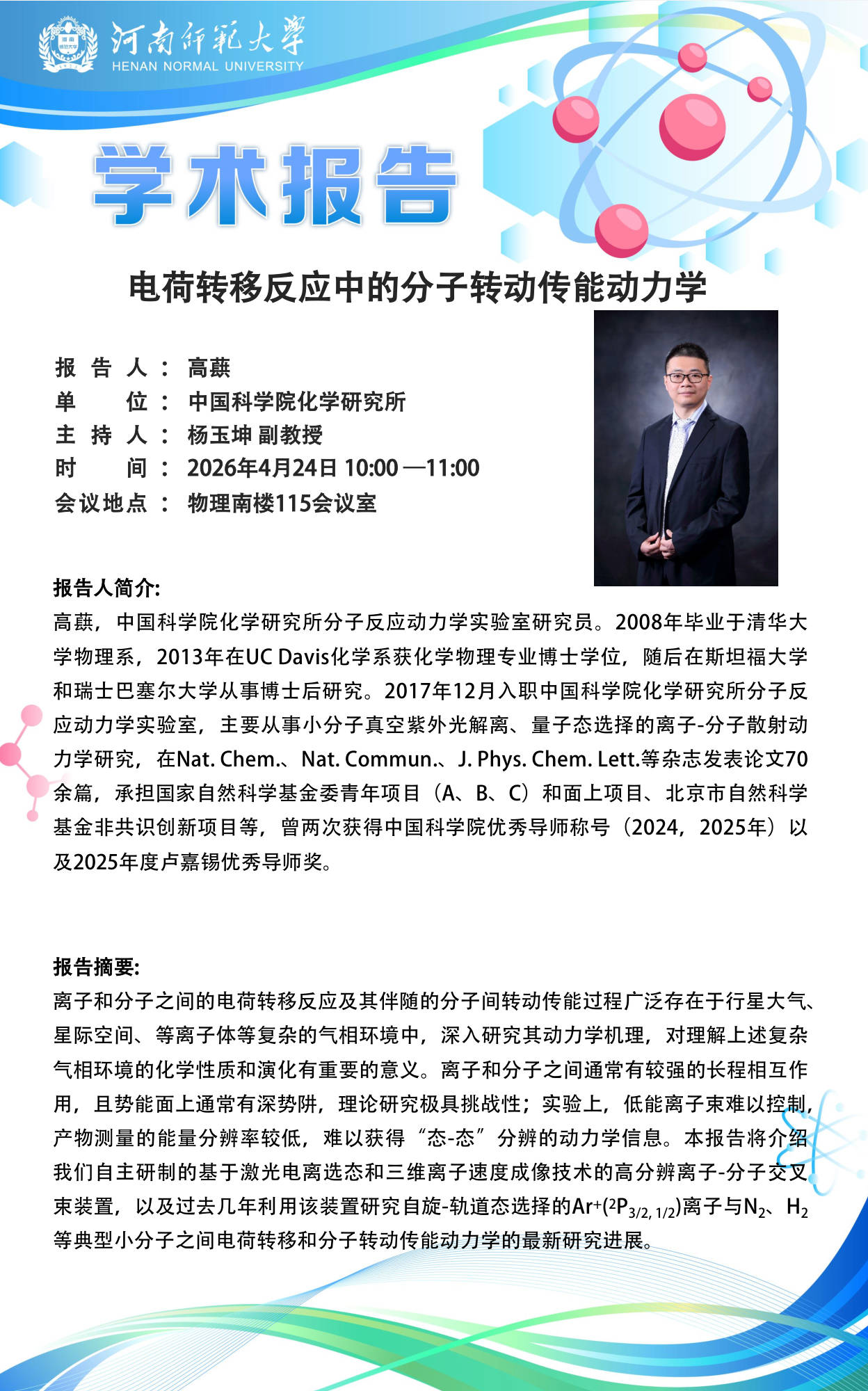 中国科学院化学研究所高蕻研究员将应邀做客“八角楼”讲坛