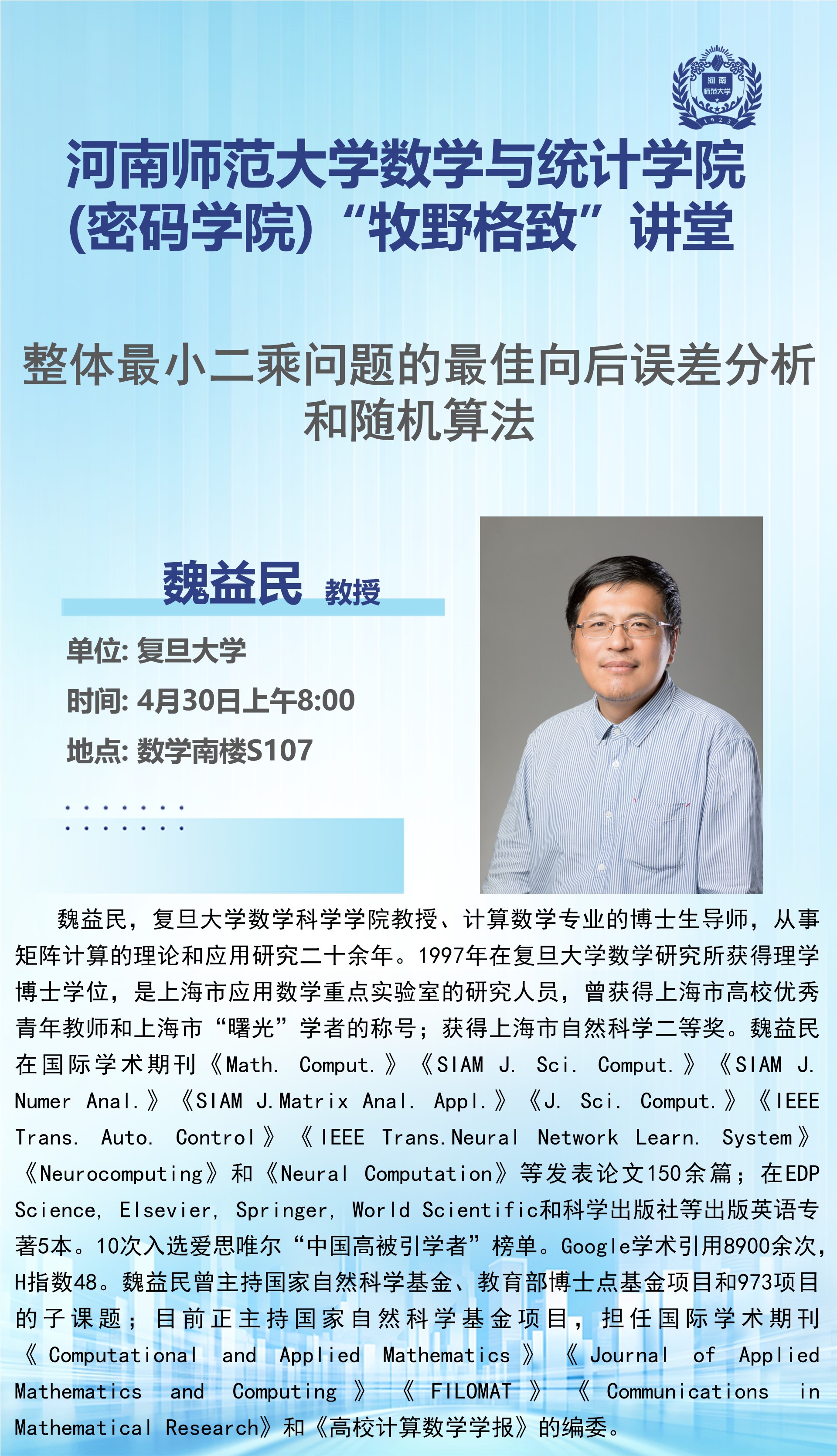 复旦大学魏益民教授将应邀做客“牧野格致”讲堂