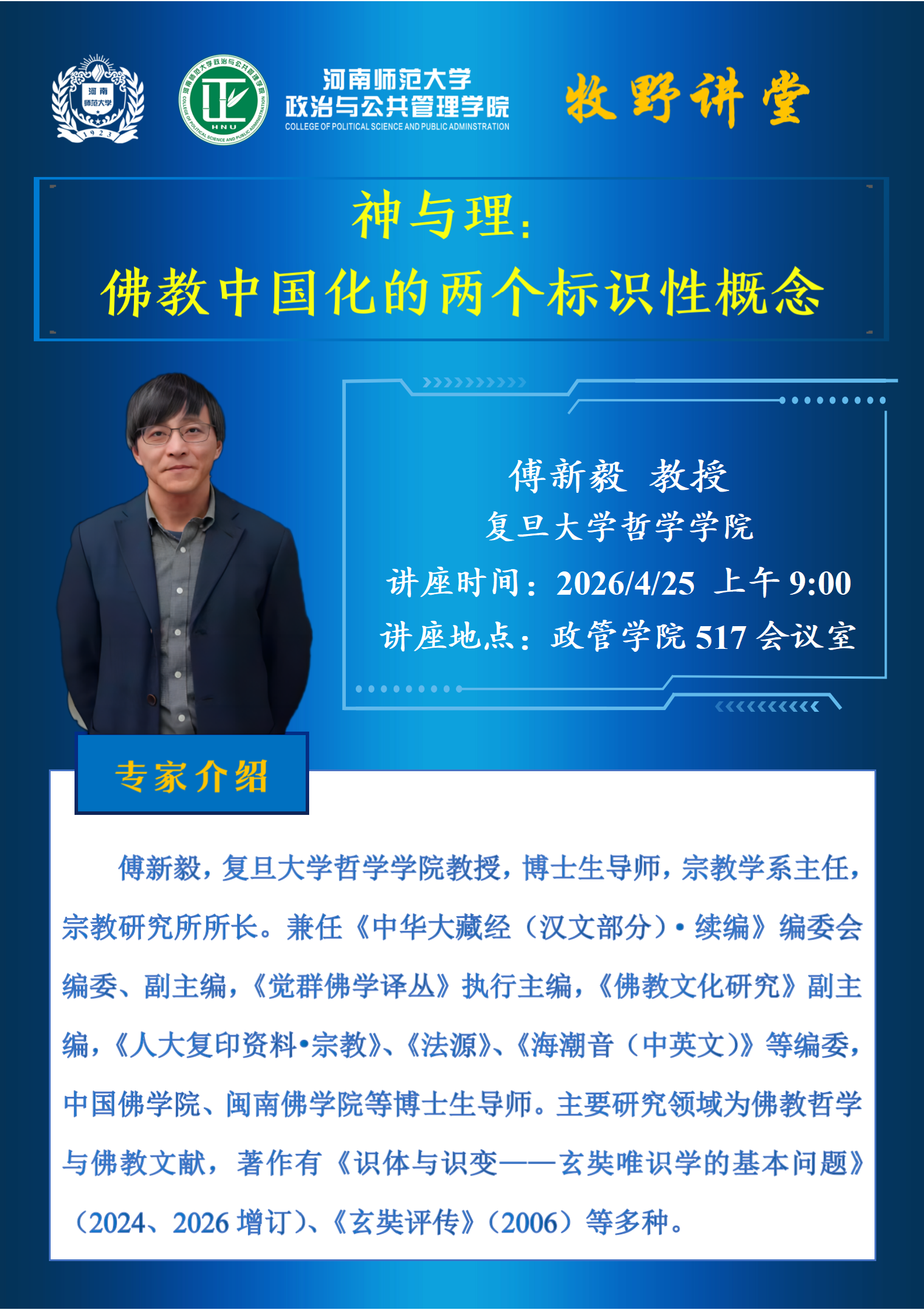 复旦大学傅新毅教授将应邀做客“牧野讲堂”