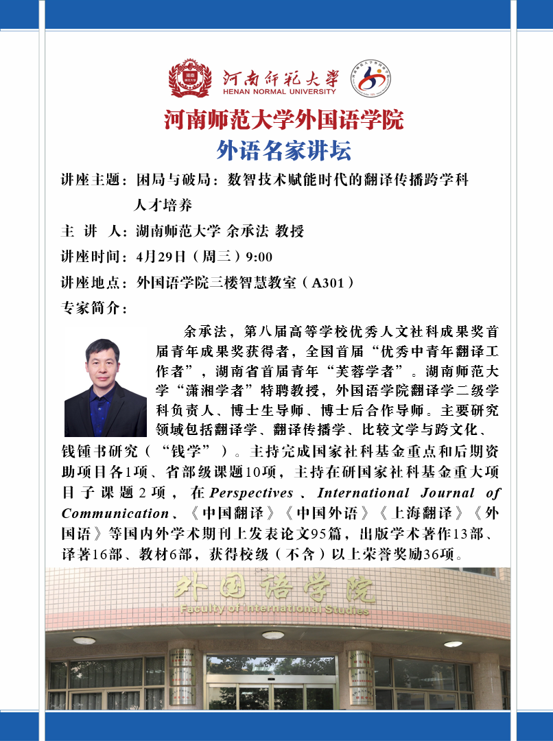 湖南师范大学余承法教授将应邀做客“外语名家讲坛”