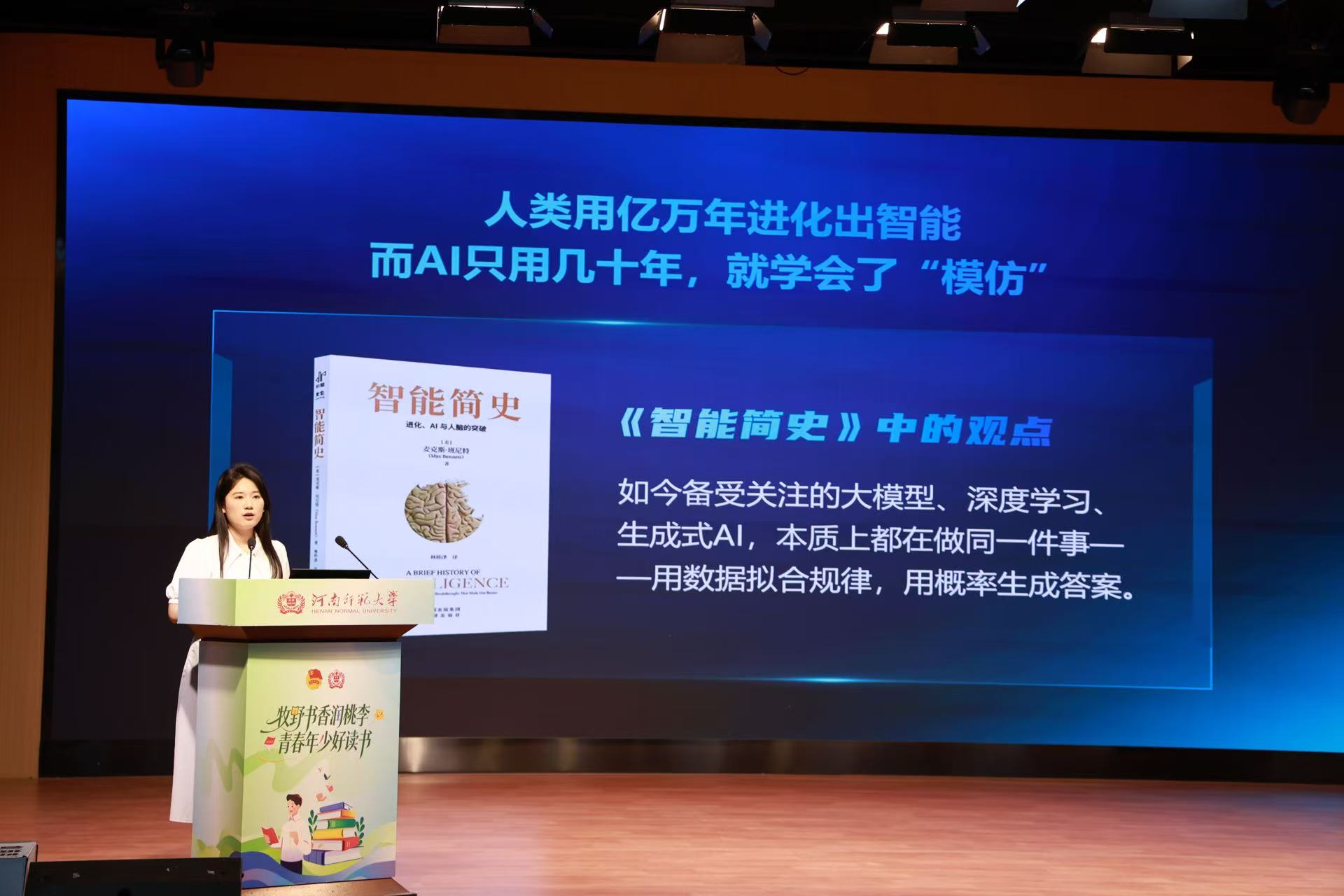 分享会现场精彩纷呈、书香浓郁。校党委副书记王玉良、图书与档案信息中心主任范黎林以及指导参与“青春阅读课”的教师代表刘苗苗、李超、张永欣、闫依铭结合自身读书经历,为同学们倾情荐书、分享感悟,传递科学阅读方法与良好阅读习惯。马克思主义学院硕士研究生武冰洁、音乐舞蹈学院本科生高晨馨以“现场演奏+朗诵”的形式,倾情演绎《青春万岁·序诗》,展现了师大青年昂扬向上的蓬勃朝气。文学院本科生陈俣伸分享郑骞《从诗到曲》,带领师生领略中华传统文学的审美意蕴与传承魅力;生命科学学院本科生徐可、计算机与信息工程学院(人工智能学院)硕士研究生刘怡琳分别解读《世界观:现代人必须要懂的科学哲学和科学史》《智能简史:进化、AI与人脑的突破》,立足专业视角探索科学本质、展望智能未来,推动科学与人文深度交融。活动最后,冯淑霞为2025年度学生“阅读达人”现场赠书,鼓励广大师生以书为伴、以读践行。