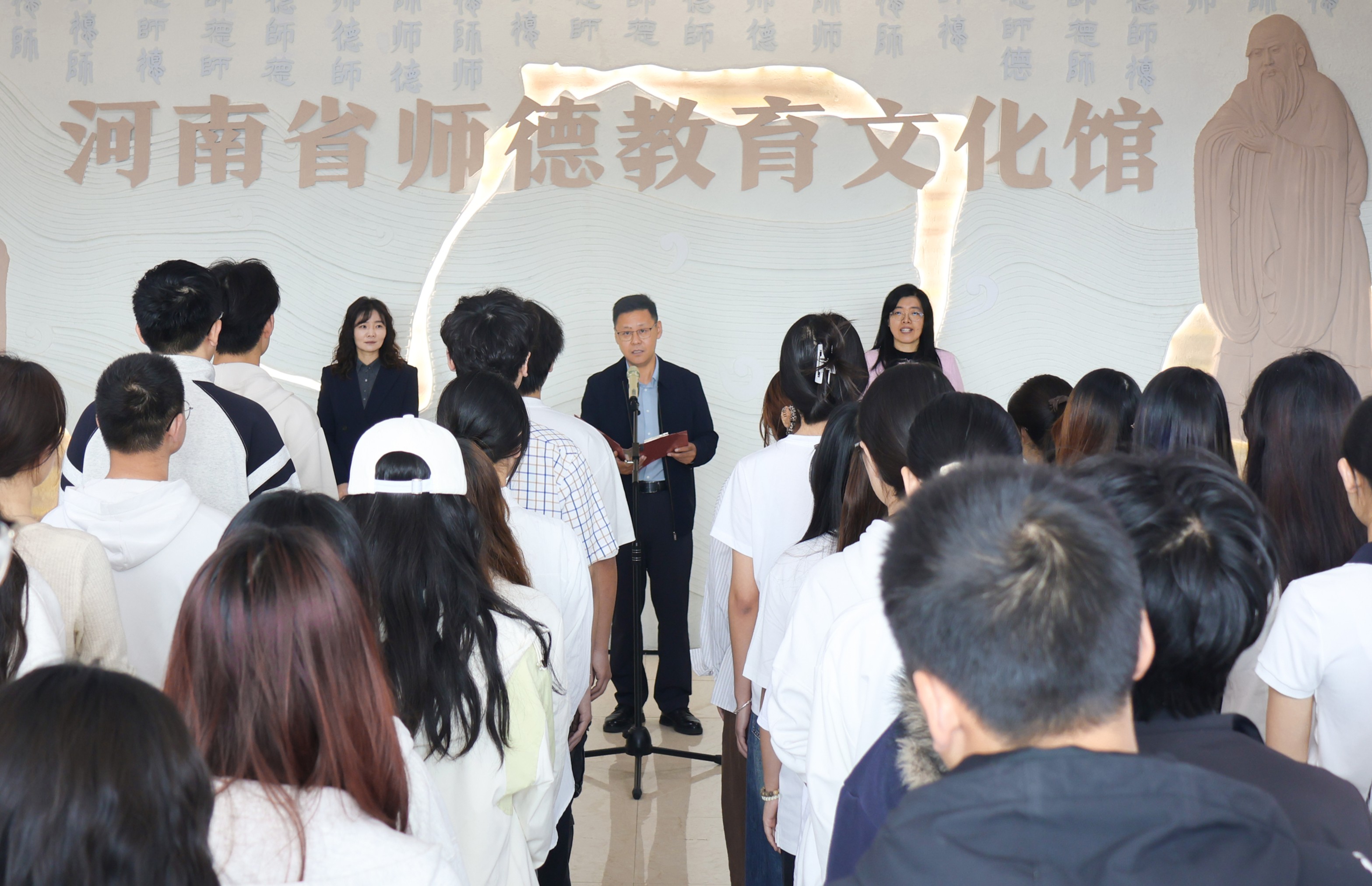 闫福丰在致辞中指出,河南省师德教育文化馆是全省首个师德教育示范阵地。本次“行走的师德课”活动把师德课堂搬进文化馆、把师道精神融入实践,推动师德教育从传统讲授走向沉浸式体验、从理论学习走向知行合一,对强化师范生师德养成、坚定教育报国信念具有重要意义。希望全体师范学子触摸千年文脉,传承师德薪火;聆听楷模故事,坚定强教信念;铭记师者初心,恪守立身准则;践行使命担当,转化学习成果,努力成长为可堪大用、能担重任的豫派名师,为教育强省、教育强国建设贡献青春力量。