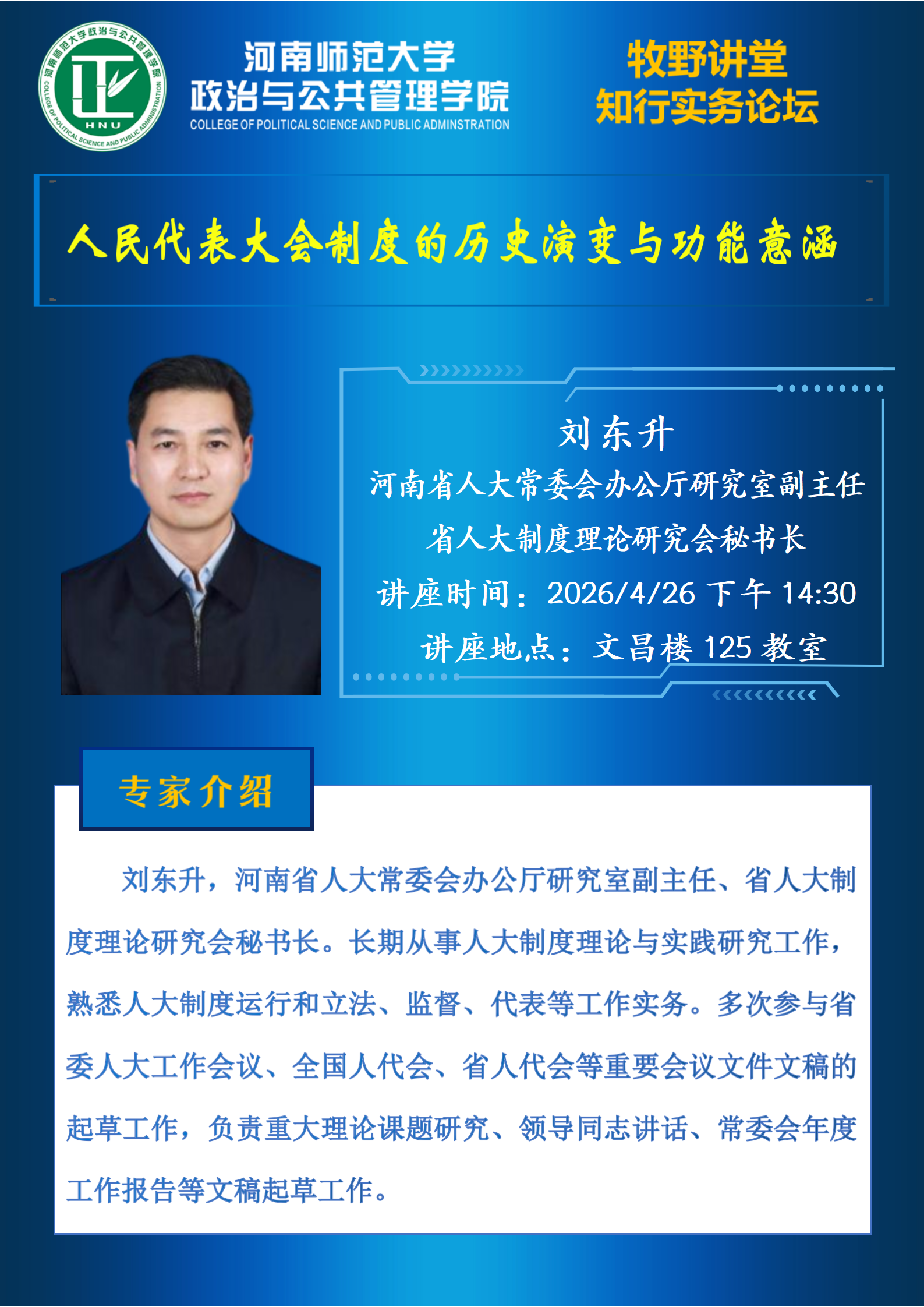 河南省人大常委会办公厅研究室副主任刘东升将应邀做客“牧野讲堂”