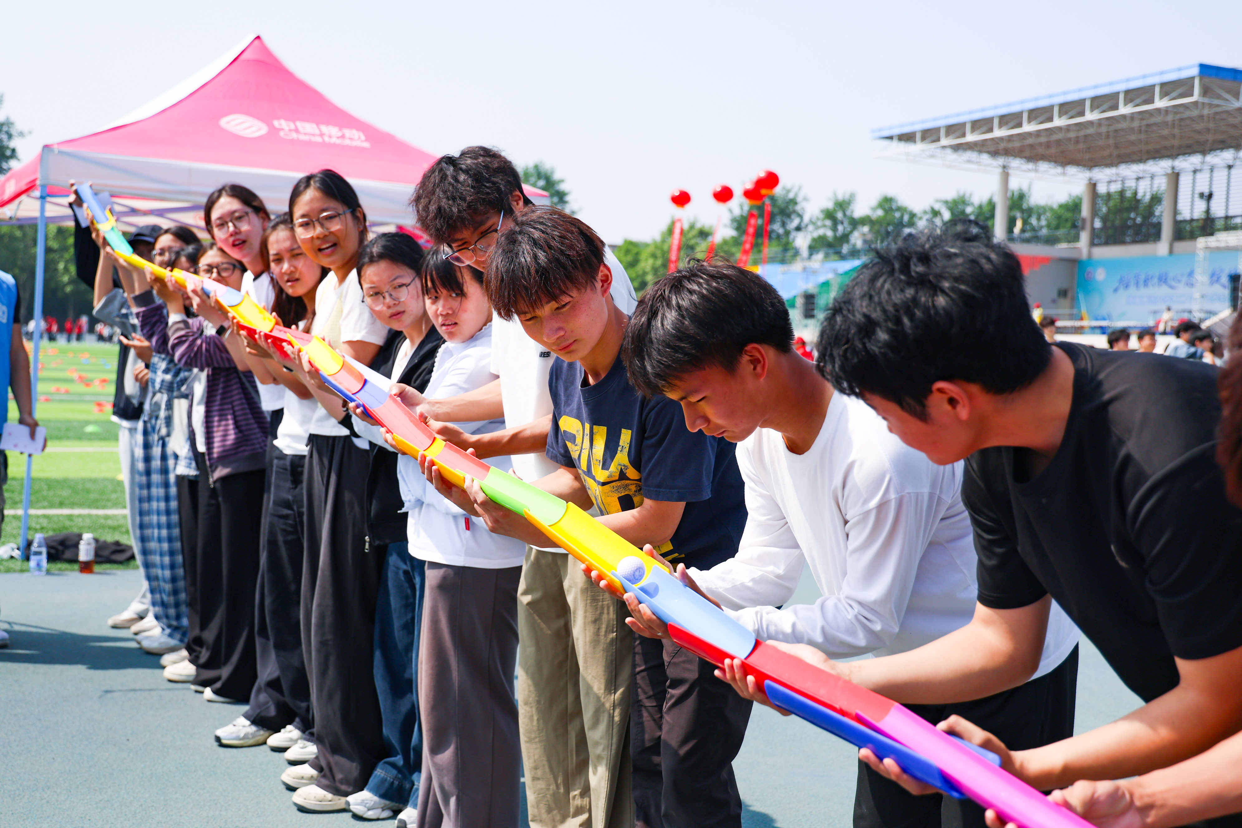 仪式结束后,与会师生齐跳健心健身操,一同参加“同心同行,活力青春”心理运动会。活动包括鸿运彩球、同舟共济、不倒森林等16个团体(个体)项目。学生们以宿舍为单位,结伴攻克层层关卡,于欢声笑语中打破心墙,在携手奋进中实现自我突破。