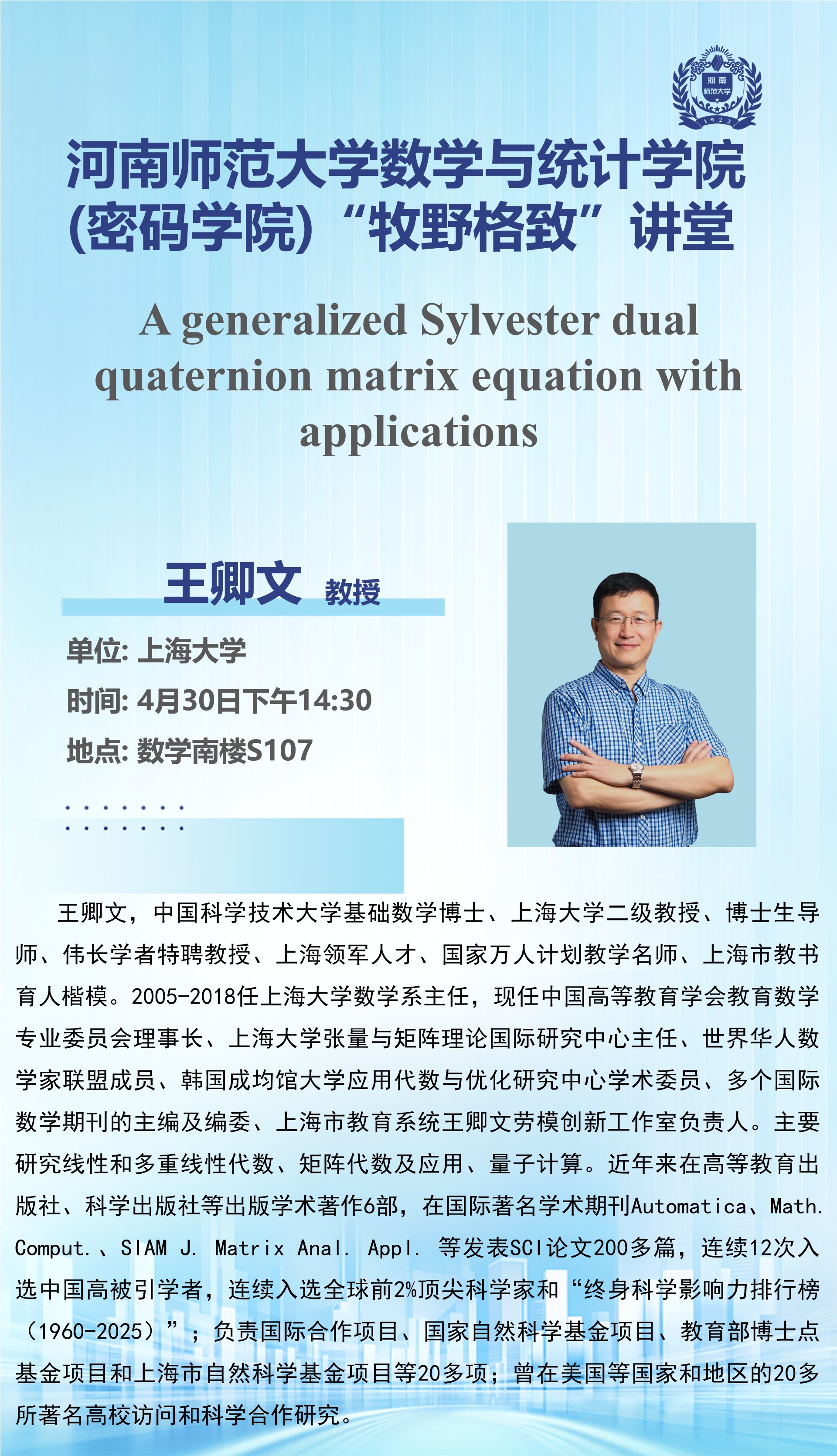 上海大学王卿文将应邀做客“牧野格致”讲堂