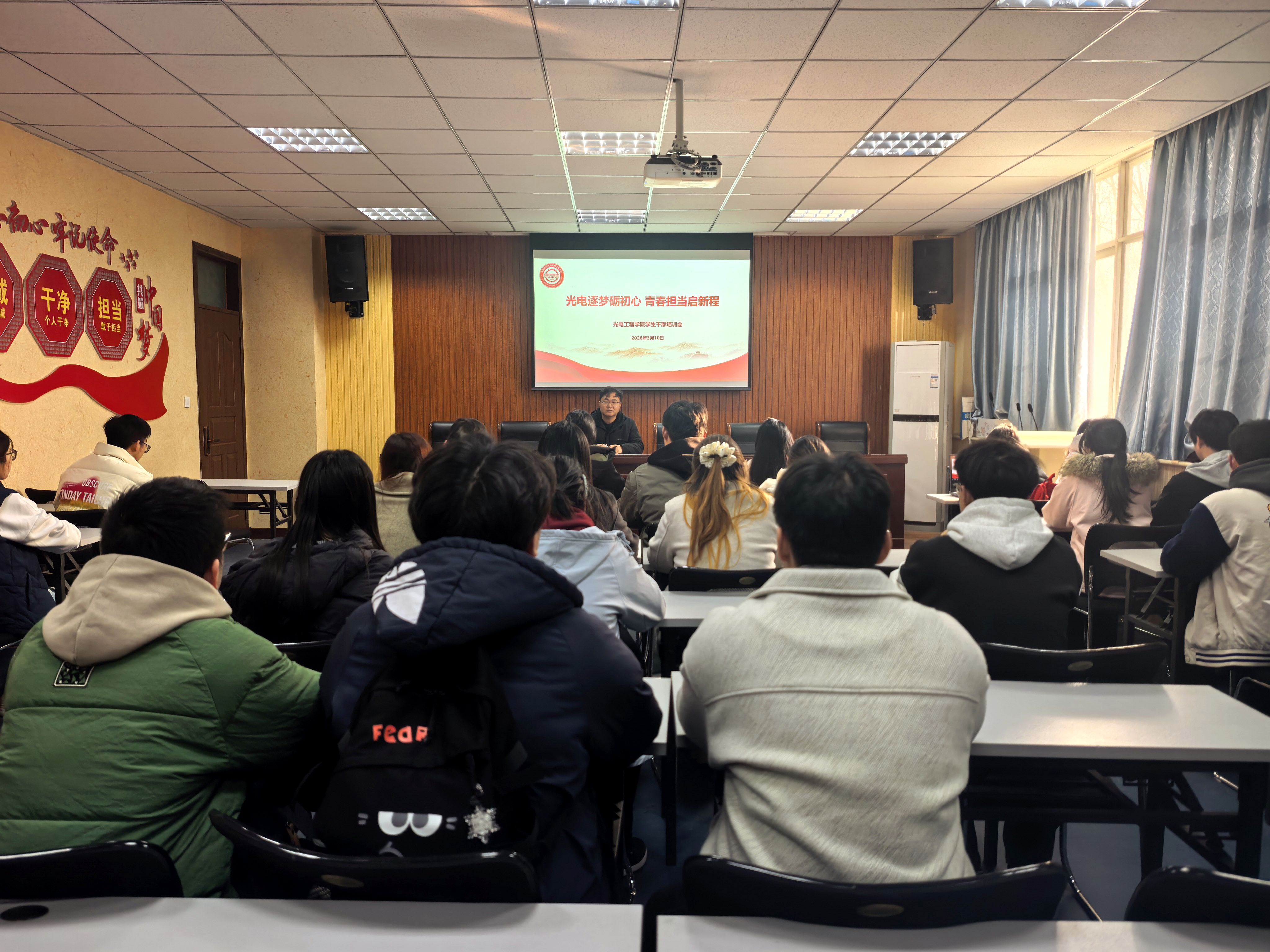 为进一步加强团学干部队伍建设,提升学生干部政治素养、业务能力与责任担当,凝聚新学期工作合力,3月10日,我院团委在物理北楼C208召开以“光电逐梦砺初心 青春担当启新程”为主题的学生干部培训会。我院团委书记付康康主持会议,我院团委、学生会全体学生干部参加培训。