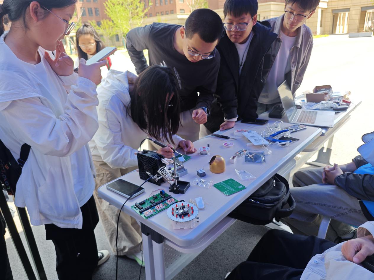 创新实践环节在三号书院有序开展。在社团骨干的悉心指导下,新社员亲手操作电烙铁,完成电子元件焊接等实操训练,成功将上午所学理论转化为实际动手能力。活动现场还展出智能桌宠、爬行机器人等作品,社员们与现场学生近距离观摩、交流探讨,在沉浸式实践中感受电子技术魅力,有效提升创新意识与实践技能。