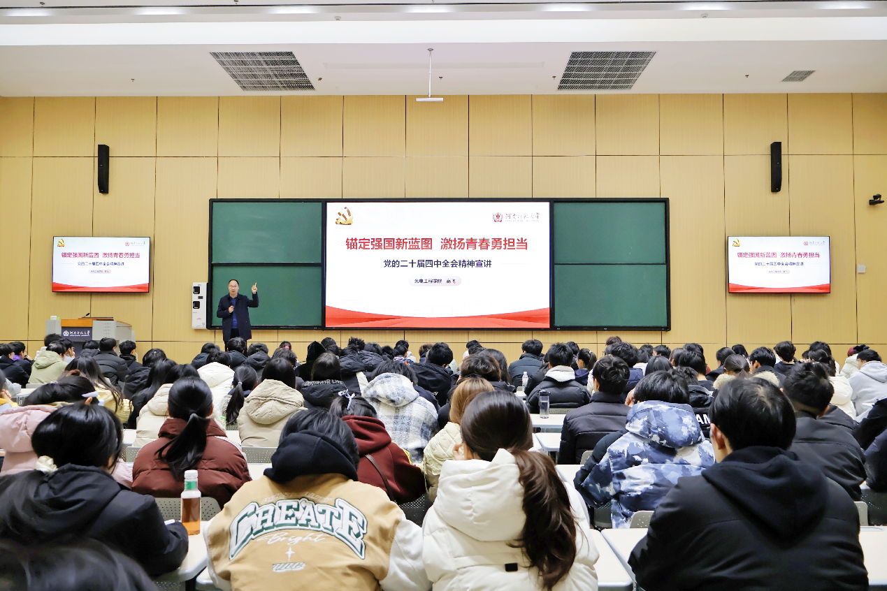 宣讲紧扣党的二十届四中全会主题,系统阐述了全会的重大意义、历史地位与深远影响,重点解读了全会关于坚持和完善中国特色社会主义制度、推进国家治理体系和治理能力现代化的一系列重大决策部署,分析了我国目前发展面临的机遇与挑战。高飞结合学院光电和电子等专业特色,指出电类专业作为现代信息社会的基石,在突破“卡脖子”技术、实现高水平科技自立自强方面肩负着重要使命。他激励同学们要深悟全会精神核心要义,将其转化为专业学习的动力与方向;夯实专业理论基础,在实践中锤炼过硬本领;找准专业与国家战略的契合点,勇探前沿,把论文写在祖国大地,以科研成果践行报国担当。