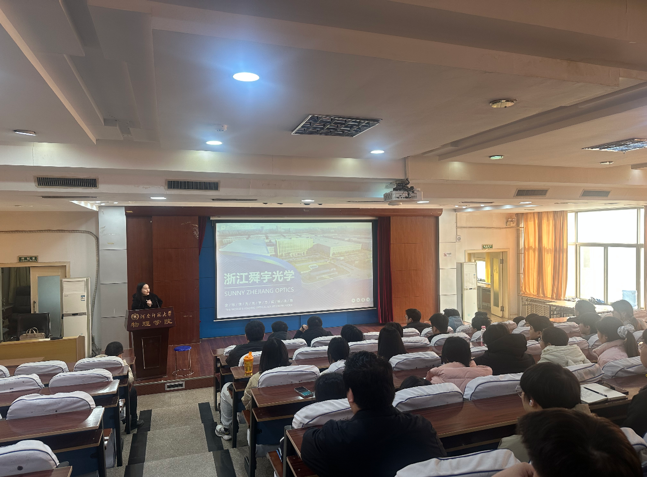 杨新伟老师出席并强调了专业实习在人才培养方案中的重要地位,希望同学们珍惜机会,在实践中巩固专业知识、提升应用能力。宣讲会特邀合作企业浙江舜宇光学科技(集团)有限公司的人力资源负责人迪雅女士进行详细介绍。她全面展示了公司的规模实力、核心业务领域、年产值状况以及人员构成,让学生对企业的产业地位有了清晰认知。随后,她系统讲解了本次实习的申请与选拔程序、实习期间的管理规章制度,并解答了实习补贴、住宿安排等学生关切的待遇问题。