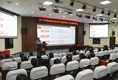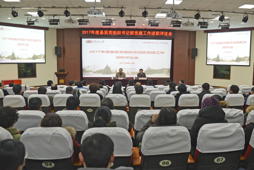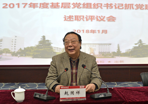 1月10日晚,我校在物理北楼三楼报告厅召开2017年度基层党组织书记抓党建工作年度述职评议会。校党委书记赵国祥出席会议并讲话。校长常俊标,校党委副书记、副校长陈广文,副校长李雪山、马治军,校纪委书记张尚字,校工会主席岳杰勇出席会议。会议由校党委副书记臧振春主持。