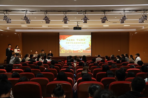 为庆祝中华人民共和国成立70周年,深入学习贯彻习近平新时代中国特色社会主义思想和党的十九大精神,10月24日晚,由新联学院党委宣传科、党委组织(统战)科主办,大学生通讯社承办的“不忘初心、牢记使命”党史知识竞赛在学院图书馆第二会议室举行。学院相关部门负责人和各院(系)学生代表等近300名师生观看了比赛。