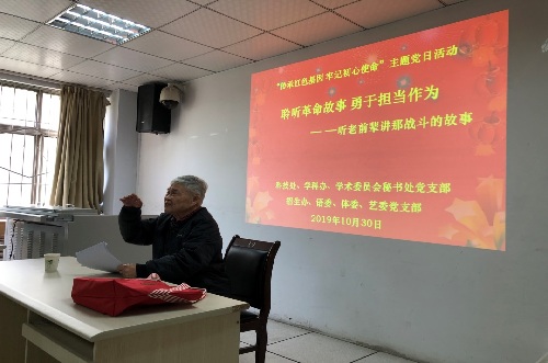 聆听革命故事,勇于担当作为,10月30日下午,机关二总支科技处、学科办、学术委员会秘书处党支部,招生办、语委、体委、艺委党支部在文渊楼229会议室联合开展“传承红色基因、牢记初心使命”主题党日活动。离退休职工管理处主要负责人、红色基因传承宣讲队成员俞雄老前辈参加活动。活动由科技处、学科办、学术委员会秘书处党支部书记田小勇主持。