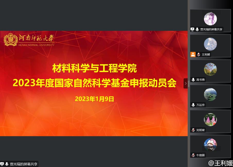 19日,材料科学与工程学院召开了2023年度国家自然科学基金申报动员会。学院领导班子成员、相关专任教师30余人线上参加了本次会议,会议由院长高书燕教授主持。