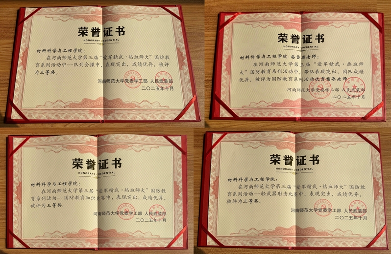 在本届国防教育系列活动中,材料科学与工程学院凭借出色的组织、严格的训练和优异的临场发挥,脱颖而出,荣获“轻武器射击比赛优胜集体”、“队列会操优胜集体”、“国防教育知识竞赛优胜集体”三项集体奖项和“‘爱我国防’演讲比赛优秀选手”一项个人奖项。负责指导的专职辅导员苗雪原因带队表现突出,被评为“国防教育系列活动优秀指导老师”。同时,我院因整体表现突出,团队成绩优异,被授予“国防教育系列活动优秀组织奖”。