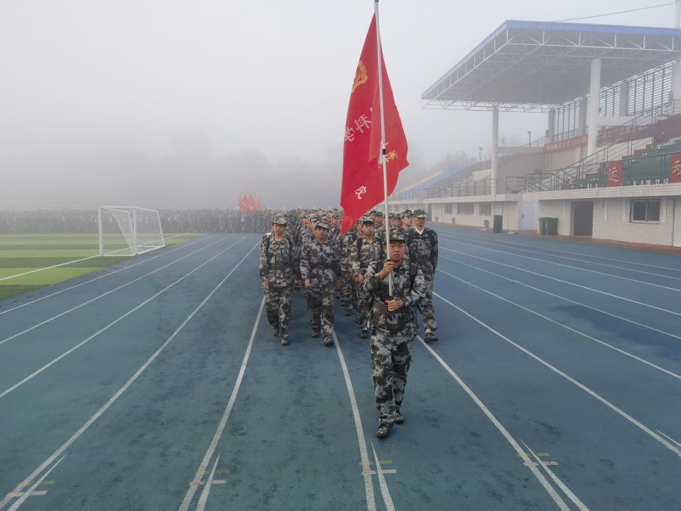 活动伊始,朝阳初升,各连队新生已在操场指定区域整齐列队。他们目光坚毅、迷彩着装统一,展现出良好的军事素养和精神风貌,在国旗护卫队组成的第一连队下,全体师生有条不紊的开展军训行军拉练。