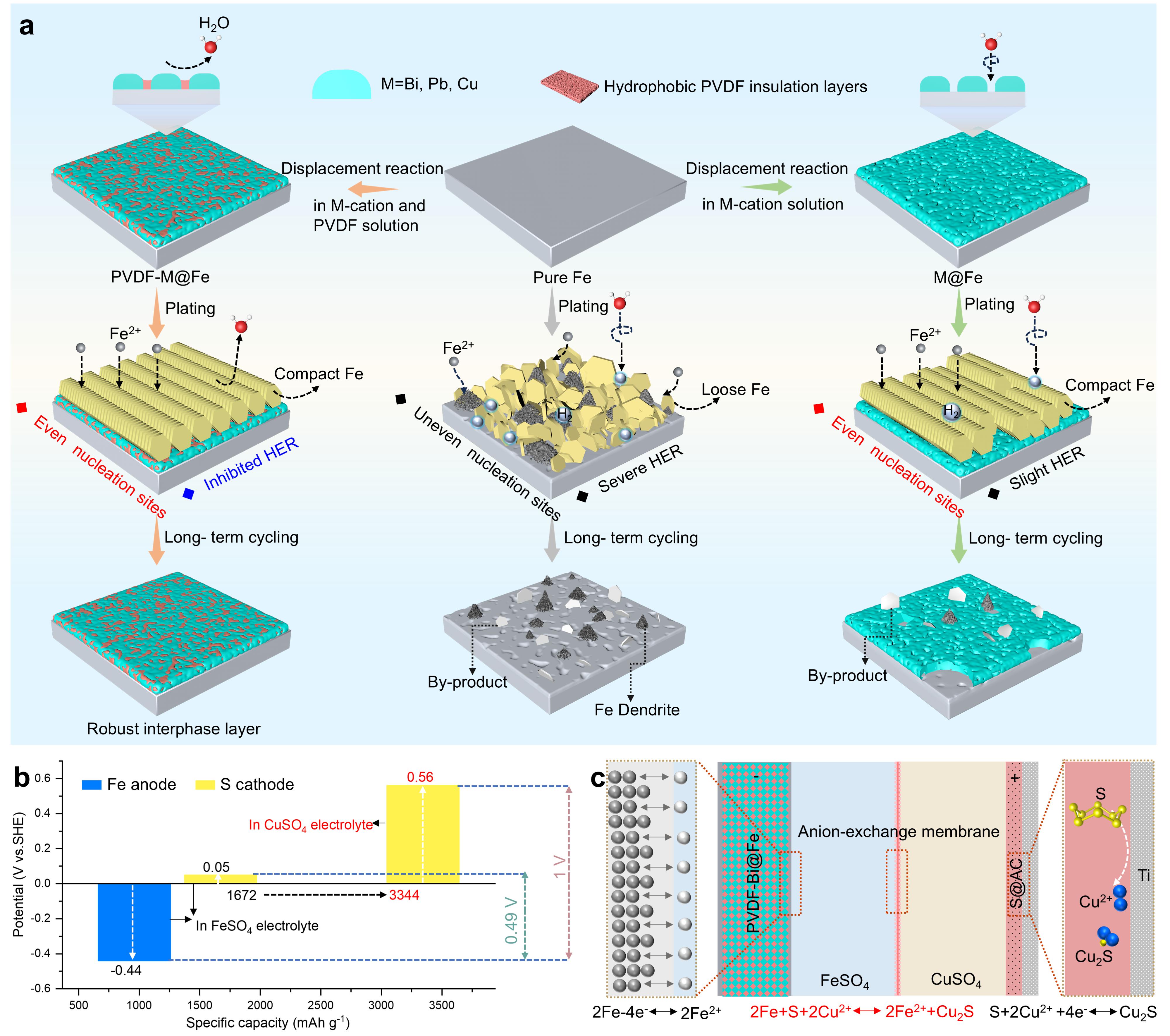 水系铁硫(Fe//S)电池凭借高理论容量与无穿梭效应的优势,在规模化储能领域极具应用潜力。然而,铁负极固有的枝晶生长、析氢与腐蚀副反应,以及低的工作电压(∼0.25 V),严重制约了电池的循环寿命与能量密度。针对上述瓶颈,本研究在铁负极表面预构建聚合物-金属复合界面层(聚偏二氟乙烯 (PVDF)-M@Fe,M = Bi、Pb、Cu),以提升电极/电解质界面的稳定性;同时采用阴离子交换膜构建解耦双电解质体系,确保正极在CuSO4电解质、负极在FeSO4电解质中解耦高效运行,从而提升电池工作电压。结合理论计算、COMSOL模拟与原位光谱表征技术,研究证实了外层PVDF能有效屏蔽铁负极与电解液的直接接触,抑制析氢反应;内层导电金属层则有助于均匀化电场并增加成核位点,实现铁负极的高度可逆沉积。基于上述优势,PVDF-Bi@Fe对称电池在1 mA cm-2的大电流密度条件下稳定循环超过412小时,优于目前已报道的绝大多数铁金属负极的循环寿命。所构建的解耦型铁硫电池(PVDF-Bi@Fe//S@活性炭)工作电压高达0.85 V(约为传统电池的3.4倍),在2 A gSulfur-1的高倍率下容量达1976 mAh gSulfur-1,显著高于典型嵌入型电极材料的比容量;电池经100次循环后容量保持率为85.42%,展现出良好的实际应用潜力与科学技术价值。