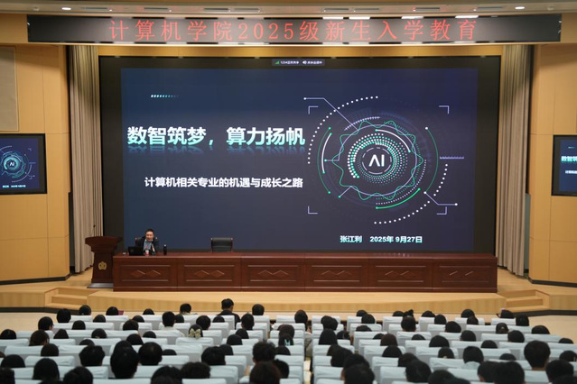 为帮助2025级新生准确把握数字时代发展脉搏,科学规划大学学习与职业发展,9月27日晚,我院成功举办以“数智筑梦,算力扬帆——计算机相关专业的机遇与成长之路”为主题的新生入学教育暨职业规划讲座。本次讲座主会场设在求真楼五楼西报告厅,分会场设在五楼东报告厅。校招生就业处招聘服务科科长张江利博士担任主讲,讲座由院党委副书记陈清利主持,2025级专职辅导员和全体新生共同参会。