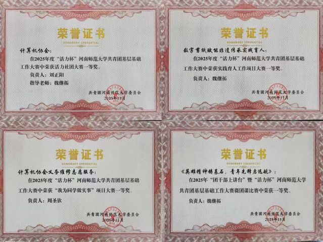 为深入学习贯彻习近平新时代中国特色社会主义思想,推动我校共青团工作在新征程中实现高质量发展,校团委组织举办了2025年度“活力杯”河南师范大学共青团基层基础工作大赛。计算机与信息工程学院(人工智能学院)积极参赛、认真筹备,在全部四项赛事中均荣获一等奖,展现出我院扎实的团建水平和昂扬的团学风貌。
