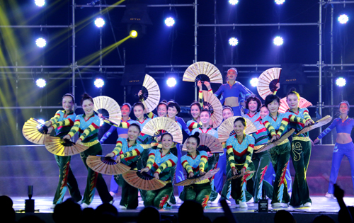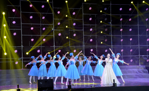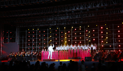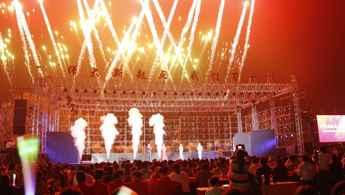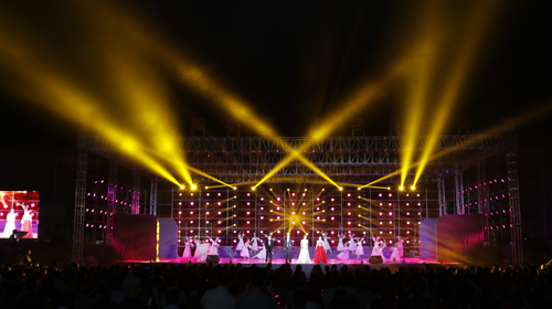 晚会现场,舞台上灯光交相辉映、霓虹璀璨,靡丽的光晕将夜空点亮;舞台下人声鼎沸、荧光挥舞,青春的欢笑把热情释放。荧光棒、欢呼声、掌声、彩色LED灯光、音乐声……师大塑胶体育场时而似一片彩色的海洋,时而又似一幅美丽的动态画卷。在绚丽夺目的烟花下,开场舞《盛世花开》中舞蹈团的姑娘们以轻盈曼妙的舞姿拉开晚会序幕。《我像雪花天上来》将2015级新同学比作飞向师大的雪花,诠释广大新同学追梦的情怀;由未来学院6期学员共同朗诵的原创诗歌《与师大一起奔跑》以恢弘豪迈的气势与激情展示出师大饱经沧桑却又历久弥新、情怀质朴而又胸襟博大的发展历史和校园文化,鼓励广大新同学保持激情和理想,牢记肩上的责任和担当,学会独立思考和敢于创新,跑好师大新起点上的第一棒;舞蹈《曙光》则以纪念抗战胜利70周年为主题,再现了师大人在烽火连天、硝烟弥漫中的坚守和执着,来向革命先辈致敬;由我校广场舞教师代表队和体育学院健美操队带来的热辣劲爆的街舞和健美操《欢庆新起点》迅速点燃全场,动感的音乐、酷炫的动作让不少观众不由自主地律动起来,将整场晚会推向高潮;而原创短剧《兄妹》则以师大的真人真事为蓝本,讲述了师大学子不畏艰难、勇敢前行,成就精彩人生的故事;以“兵马俑歌后”享誉全国、获得2015年东方卫视《妈妈咪呀》年度亚军的我校2009届校友王月芳也回到母校,深情演绎《好大一棵树》表达对老师对母校的感恩和祝福;夜色渐浓,我校特聘教授马可·贝雷依大师带领音乐舞蹈学院帕瓦罗蒂音乐艺术中心合唱团和管弦乐团共同演绎《我的祖国》等经典曲目,为现场观众展现了一幅壮丽河山图。晚会最后,全体师生起立,齐声高唱《河南师范大学校歌》,伴随着朵朵绽放的绚烂烟花,“师大新起点我们第一棒”欢迎2015级新同学文艺晚会落下帷幕。