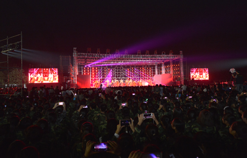 歌舞飞扬喜迎新同学,青春接力共创师大梦。9月28日晚,由校团委主办、音乐舞蹈学院承办的“师大新起点我们第一棒”欢迎2015级新同学文艺晚会在西校区塑胶操场隆重举行,为广大2015级新同学献上了一场美轮美奂的视听盛宴。校领导郑邦山、常俊标、王新生、史战芳、孙先科、陈广文、李雪山、马治军、岳杰勇等出席文艺晚会。全校各职能部门、各学院负责人,教师代表、帮训教官以及2015级全体新同学等共计1万多人观看了文艺晚会。