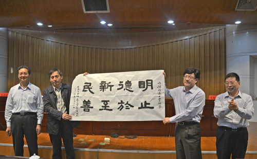 郑邦山在讲话中表示,河南大学与河南师范大学一脉相连、风雨同舟,历史同根、文化同源、精神同质、奋斗同行,两校的关系可谓“同根同源,血脉相连;肝胆相照,携手并进”。他深情回顾了两校的发展历史,指出,长期以来,两校始终互相支持,互通有无,在各个领域有着广泛而密切的联系,你中有我、我中有你的格局和相互扶持、共同发展的历史,铸就了两校历久弥新的友谊。本次活动是校党委本学期安排的干部培训、考察学习的重要内容,不仅仅是两个学校之间的交流,更是亲友的团聚,在交流中让两校师生共同感受到了“一家人”的温暖。他强调,河大作为一所百年名校,在全国占有重要地位,积淀深厚,资源丰富,在人才培养、科学研究、社会服务、文化传承等方面成就骄人,积累了丰富的办学经验;两校都是有理想、有历史、有文化、有追求、有担当的大学。希望通过此次寻根之旅、友谊之旅、学习之旅、展望之旅,进一步加深对大学精神的理解,进一步增进两校间的感情和友谊,使两校在更多领域形成更深层次的共识,在省部共建“大会师”这一广阔平台上,迎接挑战,锐意进取,勇于担当,再创佳绩。他希望两校今后进一步密切联系,加强交流,在原来良好合作的基础上,开展更加广泛深入的合作,为两校未来发展注入新的动力和活力,共同为实现“两个一百年”奋斗目标、中华民族伟大复兴的中国梦,为河南三大战略规划实施和四个河南建设做出新的更大贡献。他祝愿两校友谊长存,祝愿河大事业蒸蒸日上,再上层楼!