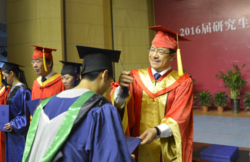 与会校领导为2016届全体博士、硕士毕业研究生颁授学位证书、拨苏正冠。全体师生齐唱校歌,仪式在雄壮的校歌声中结束。