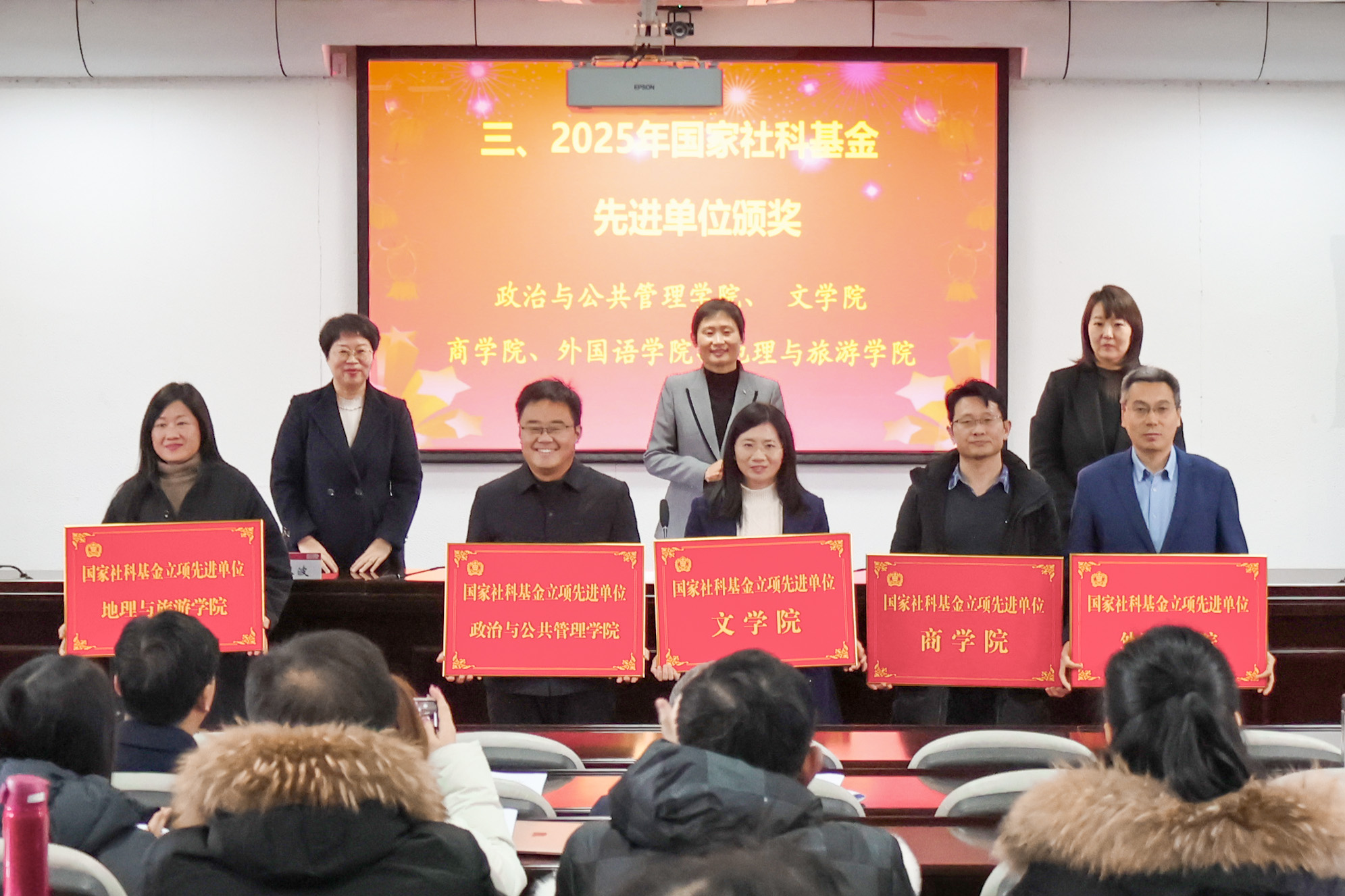 杨玉珍宣读了2025年度国家社科基金申报工作先进单位名单,冯淑霞、杨玉珍、赵黎波共同为获奖单位颁奖。