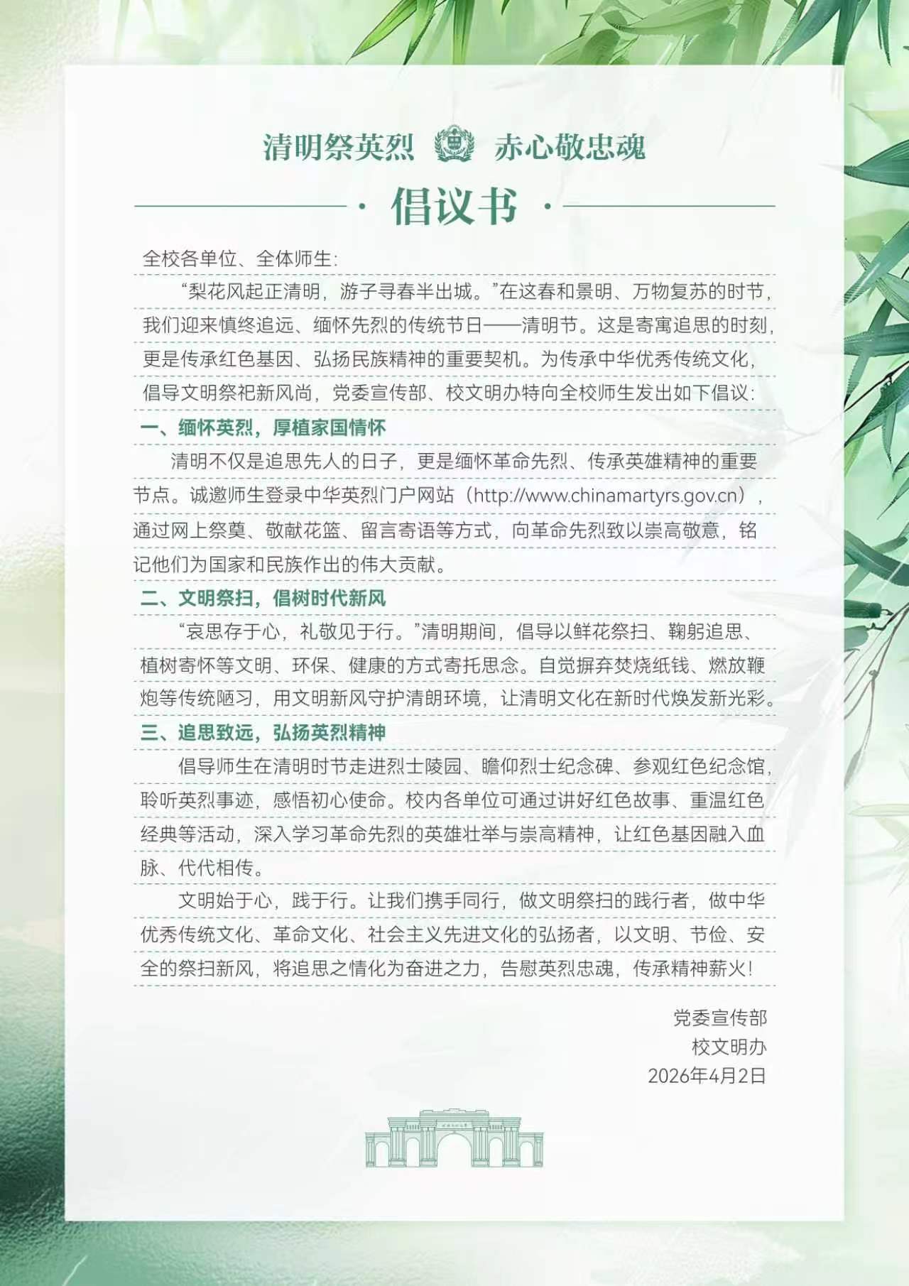 “清明祭英烈 赤心敬忠魂”倡议书