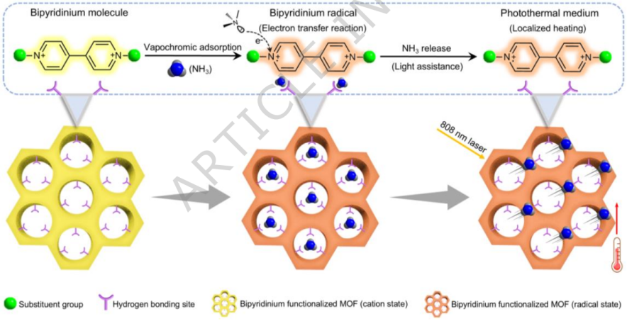 Ammonia, a critical raw material in industrial and agricultural applications, is both toxic and corrosive. Its efficient capture and detection have long posed significant challenges in the field. Traditional metal-organic frameworks (MOFs) require high-temperature vacuum treatment for ammonia desorption after adsorption, resulting in high energy consumption that severely limits their industrial application potential. Addressing this challenge, the research team developed a novel bipyridinium-functionalized MOF adsorbent for ammonia. The synthesis method is straightforward and enables gram-scale production, establishing a solid foundation for industrial applications. The material’s pore structure is rich in uncoordinated carboxylate oxygen atoms, which function as hydrogen-bonding sites to efficiently capture ammonia molecules. This design endows the adsorbent with rapid response capabilities and a low detection limit for ammonia sensing. Furthermore, the resulting radical-state product exhibits exceptional photothermal performance. Under 808 nm laser irradiation, it rapidly reaches a temperature of 121 °C, achieving a photothermal conversion efficiency of 80.75%. This localized photothermal effect effectively disrupts hydrogen bonding, enabling precise, controlled release of ammonia molecules—a process significantly more efficient than conventional thermal desorption methods. Additionally, the adsorbent demonstrates outstanding stability, with no noticeable performance degradation observed across multiple adsorption-desorption cycles.
