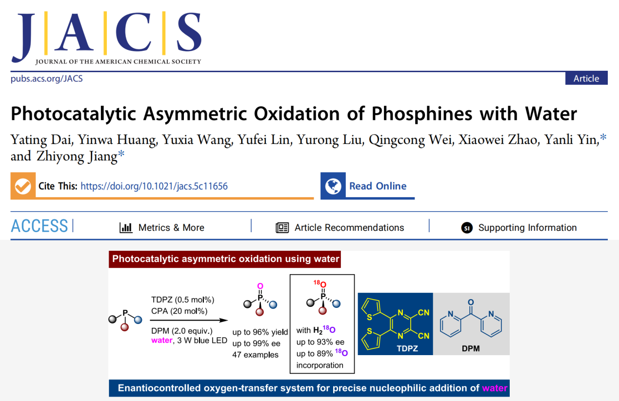 Recently, Professor Jiang Zhiyong’s research team from our university published a research paper titled Photocatalytic Asymmetric Oxidation of Phosphines with Waterin the international chemistry journal Journal of the American Chemical Society. The first author is Dai Yating, a doctoral student at our university; the corresponding authors are Dr. Yin Yanli (a young faculty member) and Professor Jiang Zhiyong; Henan Normal University isthe first author’s institution.P-chiral compounds are of sign