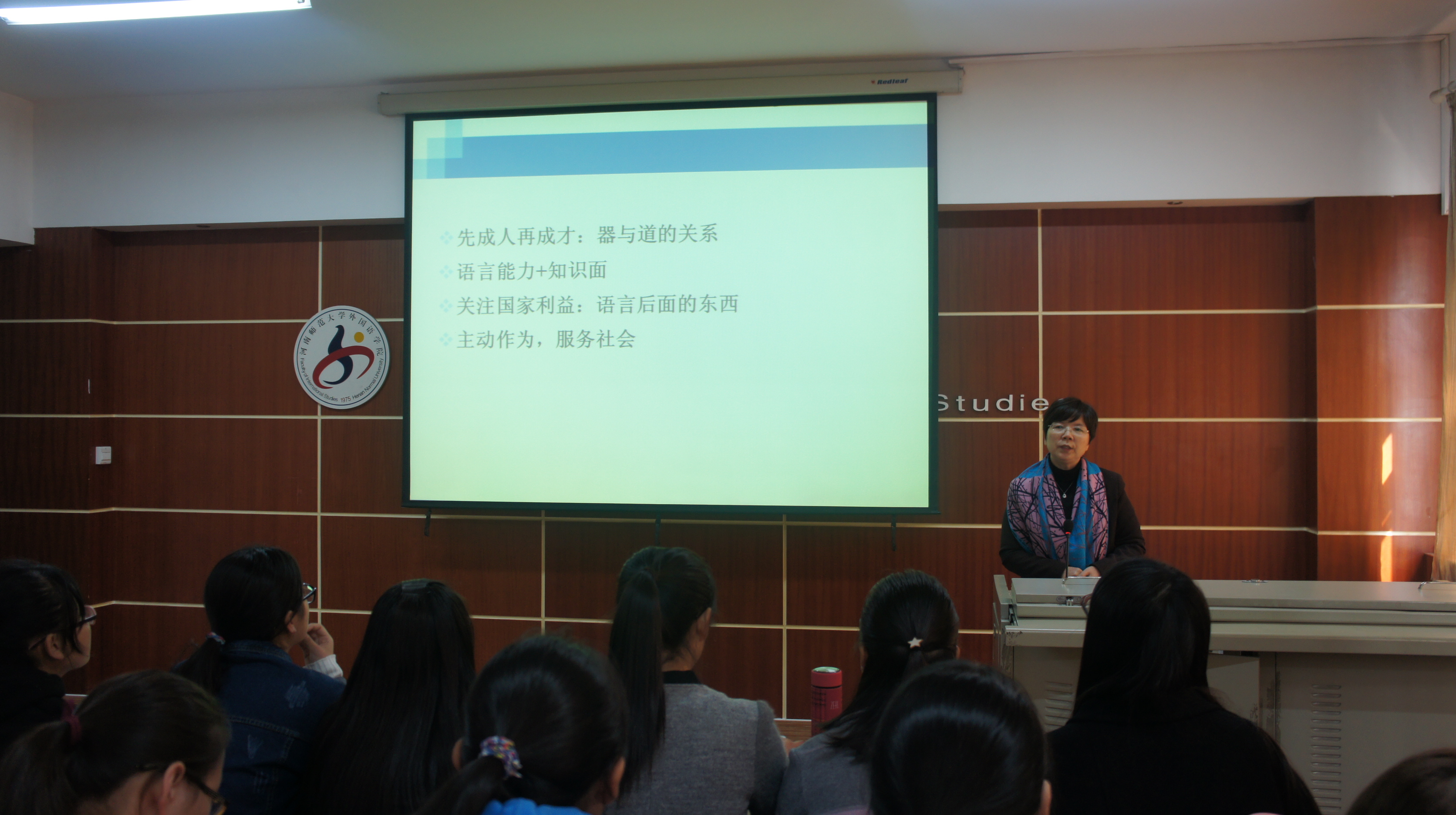 10月30日,应外国语学院邀请,广东外语外贸大学王岚教授在外国语学院国培教室作了题为“外语学习与社会”的讲座。外国语学院相关专业教师、本科生近百余人聆听了讲座。讲座由外国语学院刘国兵教授主持。