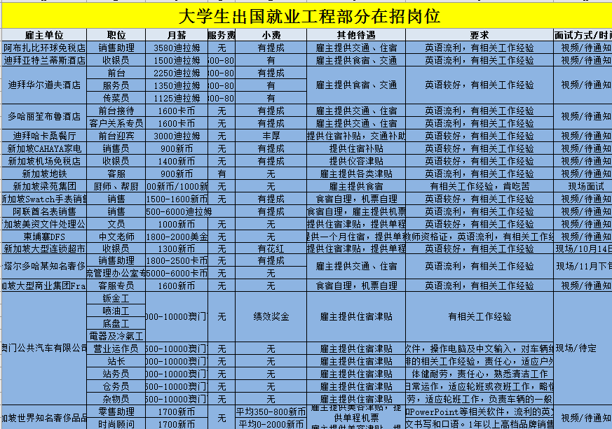主要外派国家和地区:阿联酋,卡塔尔,新加坡,马尔代夫,塞班,日本,澳门等;外派企业类别:免税店,零售业,知名品牌酒店,旅行社,乐园,高级餐厅等。职位:服务人员,销售员,客服,会计,经理,领班,导游,文员等等。目前在招岗位见附件一。