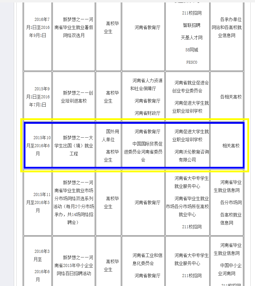 为进一步拓宽毕业生就业渠道,推动实现毕业生高质量的就业,为更多的学生提供开拓视野提升自我的工作岗位,也为郑州航空港综合试验区以及国家“一带一路”等战略储备更多国际化就业背景的高端人才,自2013年起,省教育厅联合有关厅局探索开拓了我省毕业生国际化就业渠道,2014年联合开展了“新梦想大学生出国就业工程”。目前已有400余名优秀的大学生走出国门赴阿联酋、美国、新加坡、泰国、法国、马尔代夫、韩国等国家实现国际化就业。根据2014年下发的河南省教育厅等十部门《关于联合开展河南省2016届高校毕业生“新梦想”就业创业公益帮扶行动的通知》(教学[2014]872号)文件、2015年下发的河南省教育厅等十二部门《关于联合开展河南省2016届高校毕业生“新梦想”就业创业公益帮扶行动的通知》(教学[2015]939号)文件要求,开展“河南省新梦想大学生出国(境)就业工程”(以下简称“出国就业工程”),现将出国就业工程情况介绍如下:
