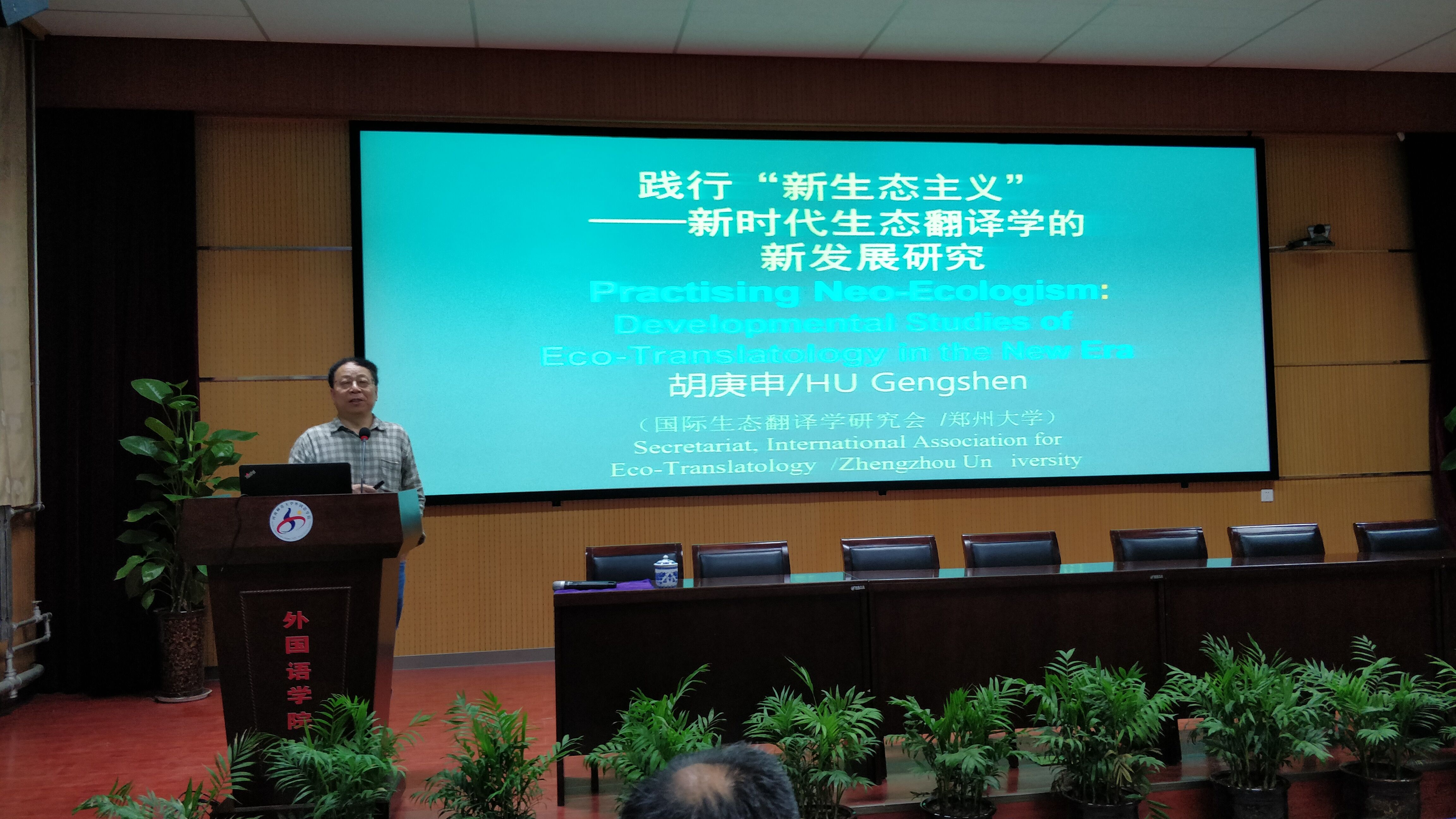 胡庚申首先从发表论文、出版专著、国际会议、研究课题等方面介绍了生态翻译学的研究现状。接着,他详细阐述了生态翻译学立论的主导思想,即新生态主义,指出新生态主义集东方生态智慧、西方生态哲学、翻译适择理论于一体。他借助《周易》中“生生之谓易”思想,将其转义生成“生生之谓译”的生态翻译学新解。最后他讲解了生态翻译学理论话语体系的建模与表达。