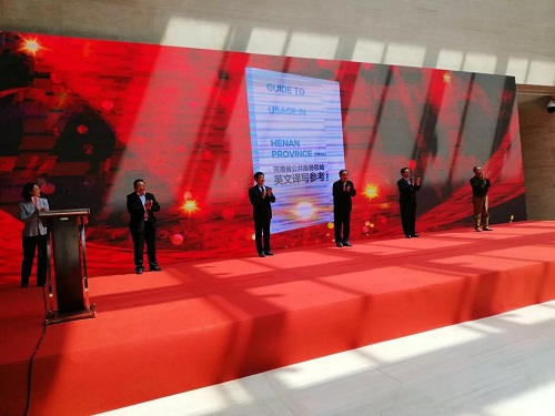 2019年5月8日上午,河南省公共服务领域外语标识规范建设启动仪式在洛阳市博物馆隆重举行。河南省人大常委会副主任徐济超、洛阳市市长刘宛康、中共中央对外联络部党群外事协调局副局长史国辉、北京语言大学党委书记/中国语言资源高精尖创新中心主任李宇明、中国翻译研究院执行院长王刚毅、郑州大学副校长屈凌波等领导出席仪式。仪式由河南省委外事办主任付静主持。会上发布了由我院教师刘国兵、齐建晓负责起草、梁晓冬参与审定的《河南省公共服务领域英文译写参考(试行)》。