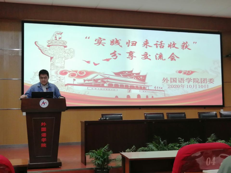 为了贯彻落实“小我融入大我,青春献给祖国;决战脱贫攻坚,投身强国伟业”的口号、有效帮助新生深入了解社会实践意义,传递暑期“三下乡”社会实践火种,1010日下午,外国语学院团委于外院报告厅举办“实践归来话收获”交流分享会,该项目的指导老师张良出席本次会议,社会实践团队队员与2020级学生代表均准时参会。