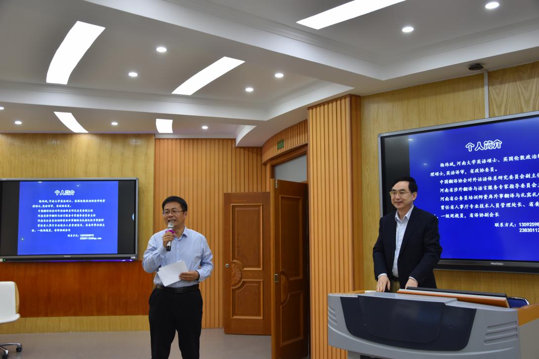 5月7日下午,中国翻译协会对外话语体系研究委员会副主任、河南省涉外翻译与语言服务专家指导委员会主任、中共河南省委外事办原副主任、一级巡视员杨玮斌译审应邀在外国语学院智慧教室作了题为“翻译河南与地方对外话语构建”的讲座。外国语学院专业教师和研究生共100余人参加此次讲座。讲座由刘国兵院长主持。