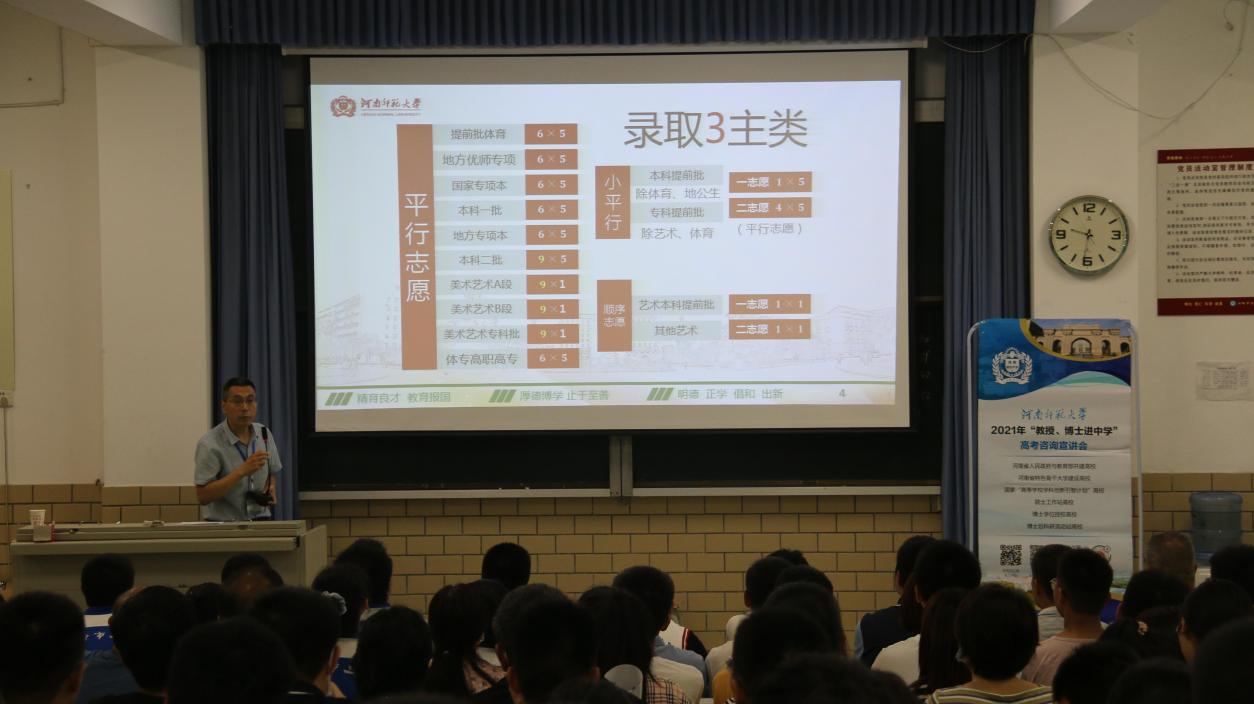 高考咨询宣传活动在新乡市二中电教室举行,学生入场阶段播放了河南师范大学“桃李春风”宣传视频。外国语学院宣讲团成员孙士超博士向新乡市二中的考生和家长介绍了高考志愿填报技巧和注意事项,围绕我校的总体情况、办学特色、专业设置、生活设施及最新招生信息进行了详细介绍,欢迎莘莘学子报考我校。最后,宣讲小组成员曹崇副书记、孙士超博士、刘晓涵老师与现场学生、家长进行互动交流,耐心细致地解答师生关心的各种具体问题,针对学生具体分数、省内位次进行了志愿填报的详细解答,对有意愿报考河南师范大学的学生及家长进行了详细的专业、录取最低分数介绍。