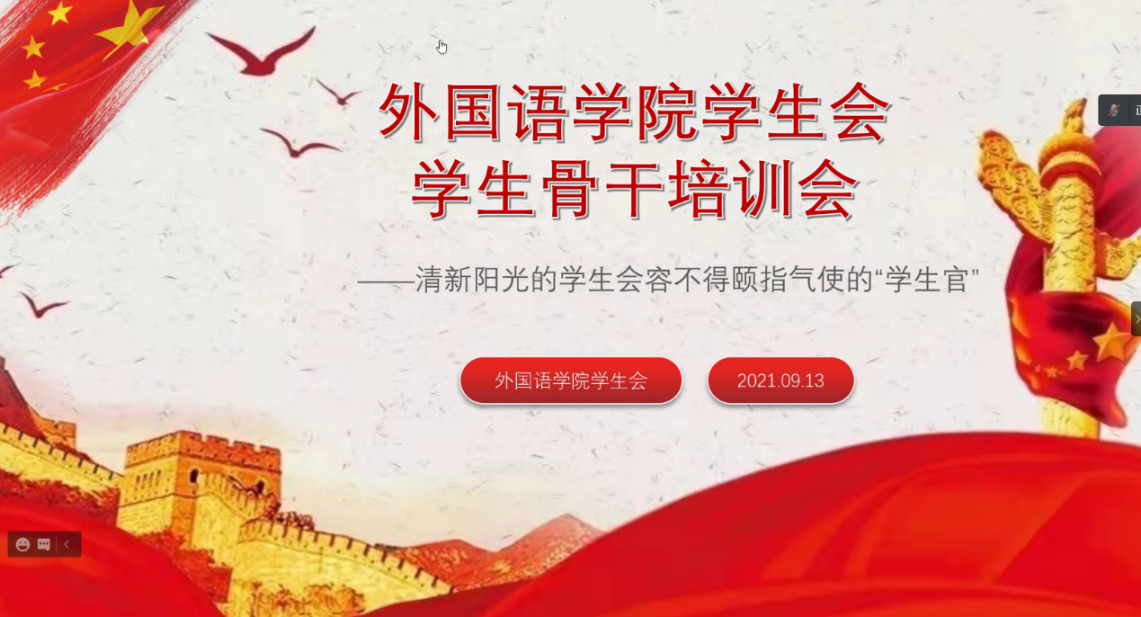为营造平等氛围、遏制庸俗习气,号召我院学生会成员恪守学生本分,牢记服务宗旨,永葆理想情怀,9月13日晚,外国语学院学生会召开学生骨干线上培训会议,集中开展《清新阳光的学生会容不得颐指气使的“学生官”》及《关于学联学生会工作人员改进作风服务同学的若干规定》等相关文件学习研讨。 会议伊始,学生会全体成员共同观看了近期网上热传的某高校学生会查寝视频。随后,主席团郭亚明对学生会上学期的工作进行总结,并提出对本学期学生会的整体工作愿景。纪检权益部许培琪结合部门工作特点和要求,以上学期的“我爱我家”宿舍评比活动为切入点,谈到自己对于学生会职责的认识:“我们要发挥吃苦肯干的优良精神,坚决抵制所有不良风气。”志愿者服务部张珊珊就志愿者服务部的工作特点也谈到自己的感悟:“我们要发扬好‘奉献,友爱,互助,进步。’的志愿者精神,做到热爱奉献、与同学友爱相处。”心理部黄亲瑛、体育部王子晗、网络设计部詹冠之等几位同学也发表自身感悟,纷纷表示要坚守加入学生会的初心,真正做到心系同学,服务同学。 会议尾声,主席团郭亚明对会议进行总结:“只有真心付出,才能够获得自身的成长提高,才能赢得同学们的真诚尊重。希望我们大家在这个有爱的集体里,奉献属于自己的一份力量,收获属于自己的一份成长!”此次会议引领了正确方向,推进了服务意识入脑入心。未来,外国语学院学生会全体成员将进一步提升服务同学的意识和能力,争取在围绕中心、服务大局中贡献更大的力量。 (外国语学院 戎雨)