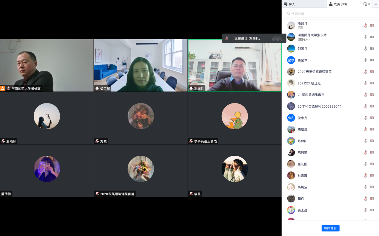 2月13日上午,外国语学院在线召开2020级硕士研究生校外实践动员会。外国语学院院长刘国兵、副院长娄宝翠、MTI中心主任张长辉、研究生辅导员钱江红、全体硕士生导师和107名教育硕士、翻译硕士研究生参加了动员大会。