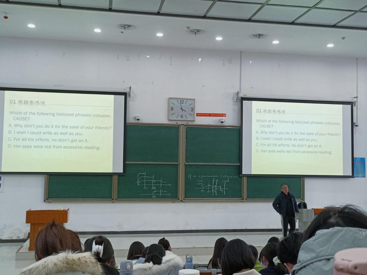 随后,赵波老师围绕专四语法知识展开讲授。他通过生动活泼的举例、幽默诙谐的语言,帮助与会同学梳理了重要的语法结构,大家也在阵阵欢笑中深刻理解了情态动词、虚拟语气、倒装、从句等专四考试的语法重难点。讲座最后,赵波老师以真挚的语言祝愿同学们在学习语言的过程中保持自己的耐心、好奇心以及强烈的求知欲,在未来的学习道路中积极向上,锐意进取,赢得了在场学生们的一致赞同。