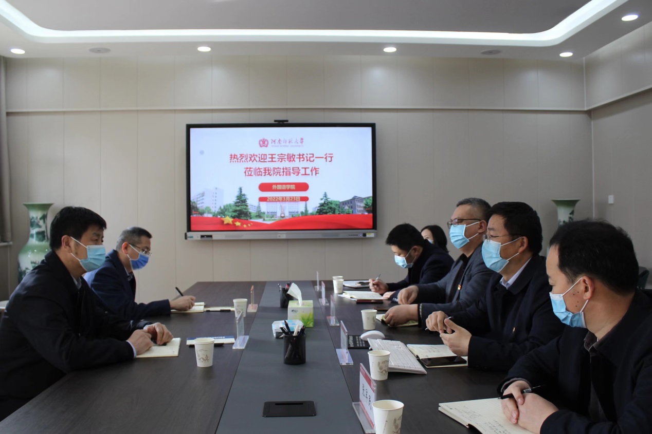 3月23日上午,校党委书记王宗敏在党委办公室主任秦法跃的陪同下莅临外国语学院调研指导工作。院党委书记包晓光、院长刘国兵、副书记曹崇、副院长张军民、娄宝翠及党政办负责人参加调研。