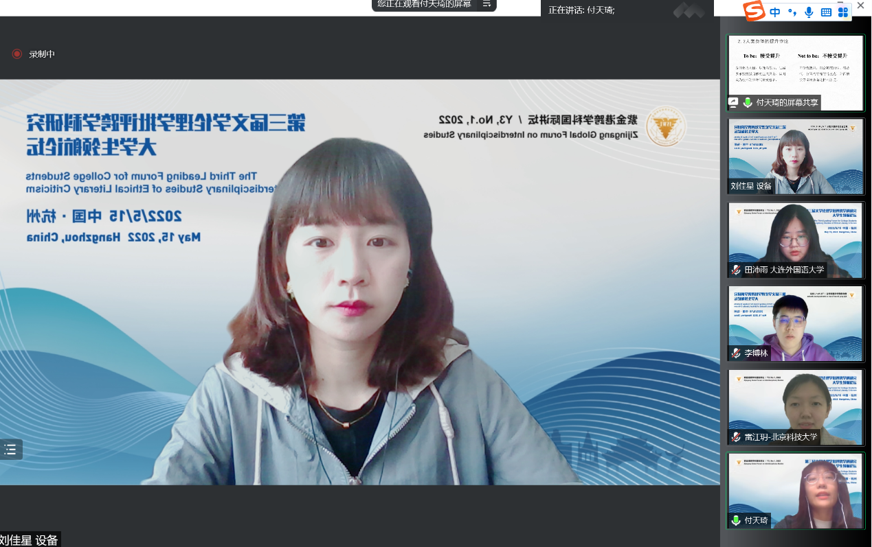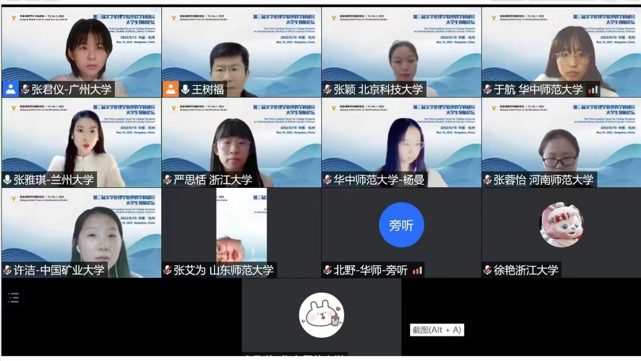 2022年5月15日,由浙江大学世界文学跨学科研究中心、浙江大学本科生院教务处通识教育中心、浙江大学外国语学院英文系联合英国华威大学、韩国外国语大学、菲律宾圣托马斯大学共同主办的“紫金港跨学科国际讲坛”系列学术活动之第三届文学伦理学批评跨学科研究大学生领航论坛在浙江大学紫金港校区成功举办。我校外国语学院2020级英美文学专业张蓉怡,2021级比较文学与世界文学专业刘佳星在梁晓冬教授指导下参加会议并围绕文学伦理学批评基础理论与文本分析做讨论发言。