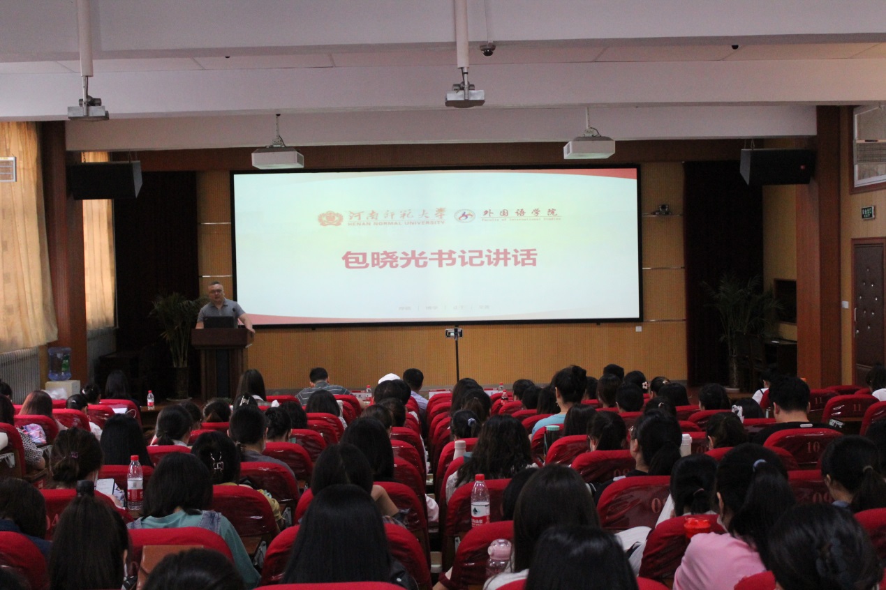 5月20日下午,外国语学院于学院报告厅召开2019级考研动员大会,院党委书记包晓光、院长刘国兵、院党委副书记曹崇、副院长张军民、娄宝翠出席会议,会议于线上线下同时进行,外国语学院全体学生参会。会议由2019级辅导员刘晓涵主持。